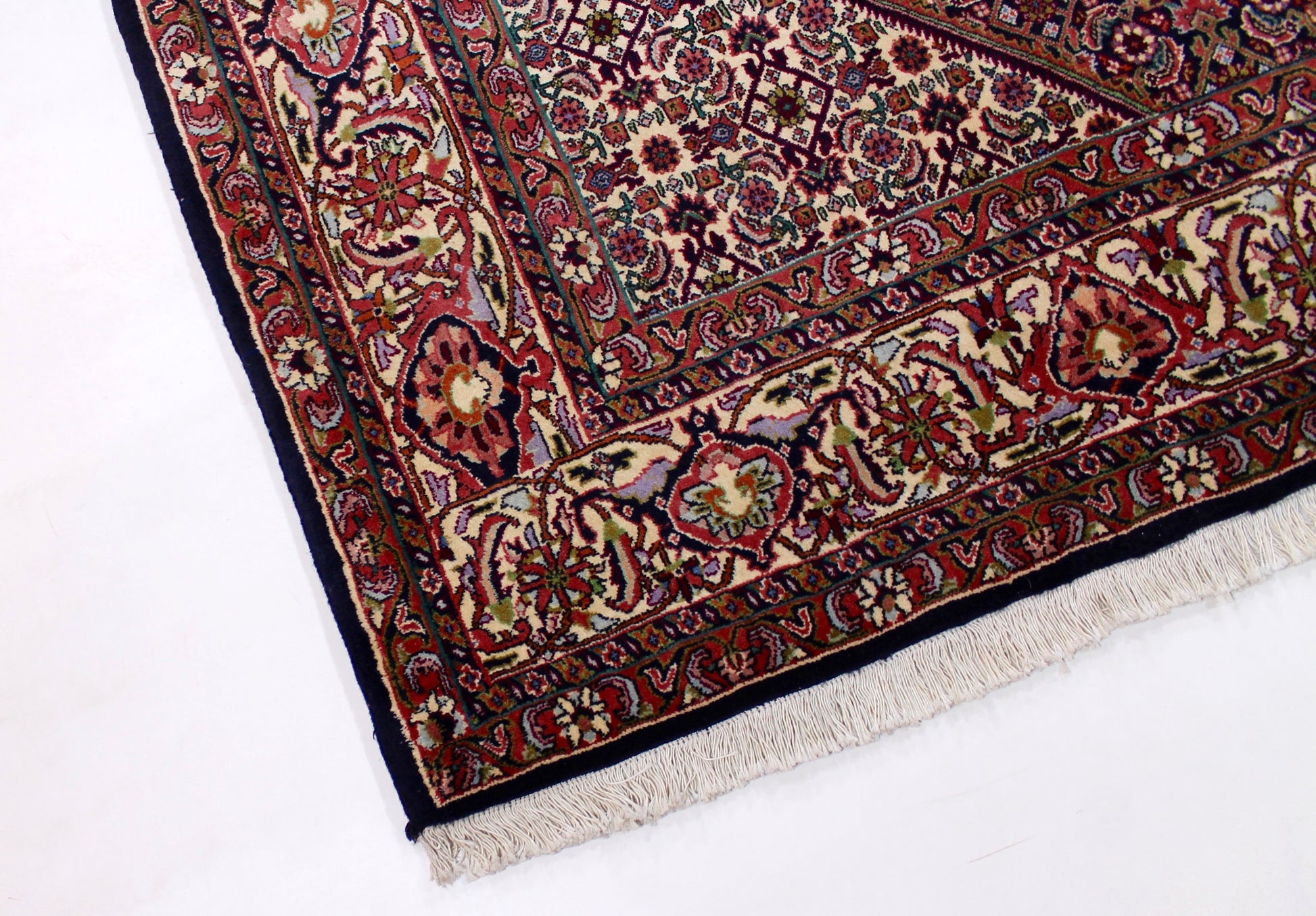 Bei der Knüpfung wird der im Teppich quer verlaufende Schussfaden angefeuchtet und mit einem Eisenkamm fest eingeschlagen. Dadurch wird die Knüpfung so dicht und fest, dass Schmutzpartikel kaum die Chance haben, sich festzusetzen. Das ist eine kraftaufwendige Arbeit und daher werden Bidjar-Teppiche meist von Männern geknüpft.
