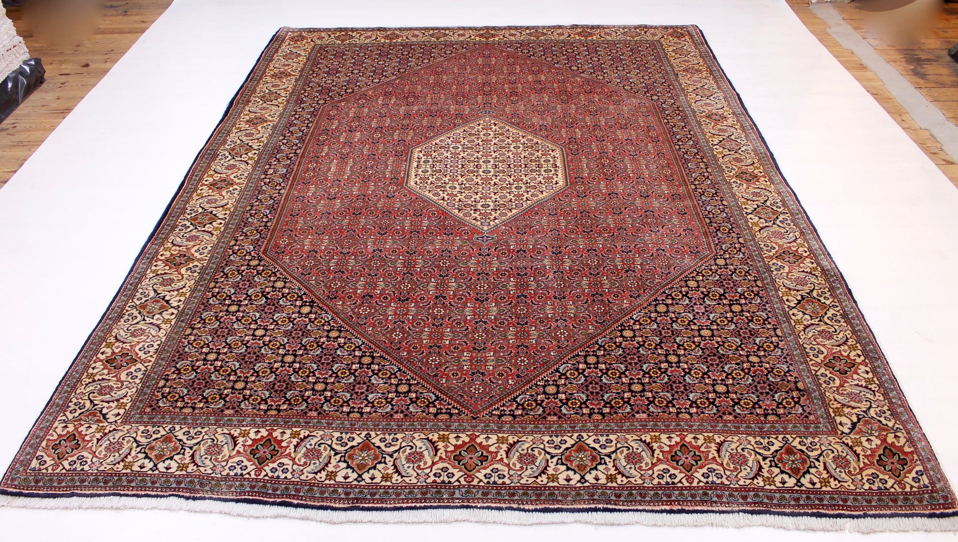 Bei der Knüpfung wird der im Teppich quer verlaufende Schussfaden angefeuchtet und mit einem Eisenkamm fest eingeschlagen. Dadurch wird die Knüpfung so dicht und fest, dass Schmutzpartikel kaum die Chance haben, sich festzusetzen. Das ist eine kraftaufwendige Arbeit und daher werden Bidjar-Teppiche meist von Männern geknüpft.