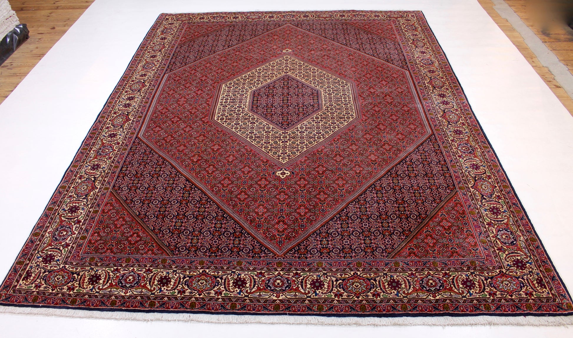 Bei der Knüpfung wird der im Teppich quer verlaufende Schussfaden angefeuchtet und mit einem Eisenkamm fest eingeschlagen. Dadurch wird die Knüpfung so dicht und fest, dass Schmutzpartikel kaum die Chance haben, sich festzusetzen. Das ist eine kraftaufwendige Arbeit und daher werden Bidjar-Teppiche meist von Männern geknüpft.