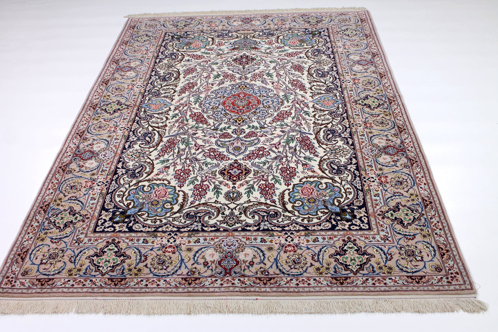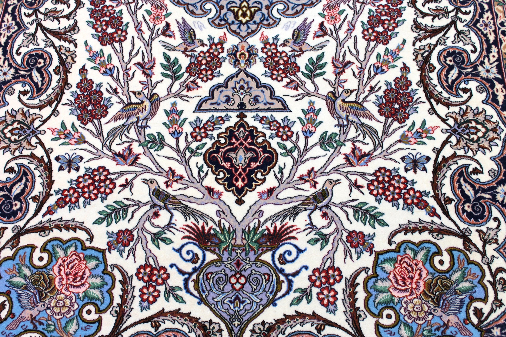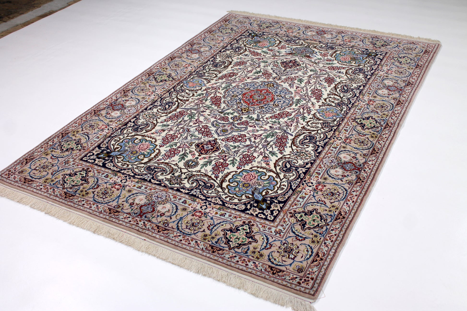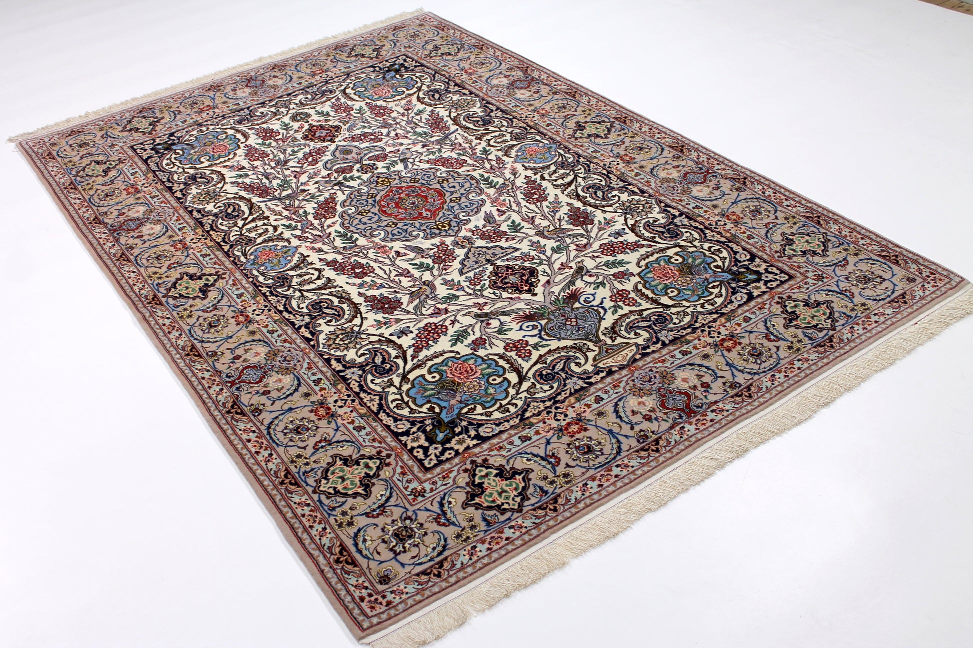 Wer schon einmal den Iran bereist hat, hatte Isfahan ganz oben auf seiner Liste. Sie ist die wahrscheinlich schönste Stadt des Landes. Das ist der ca. 200-jährigen Besetzung durch die Safawiden zu verdanken, deren König Shah Abbas eine große Leidenschaft für Kunst und Architektur hatte. Dieser Isfahan wurde aus hochwertiger Seide und Schafwolle von Hand geknüpft.