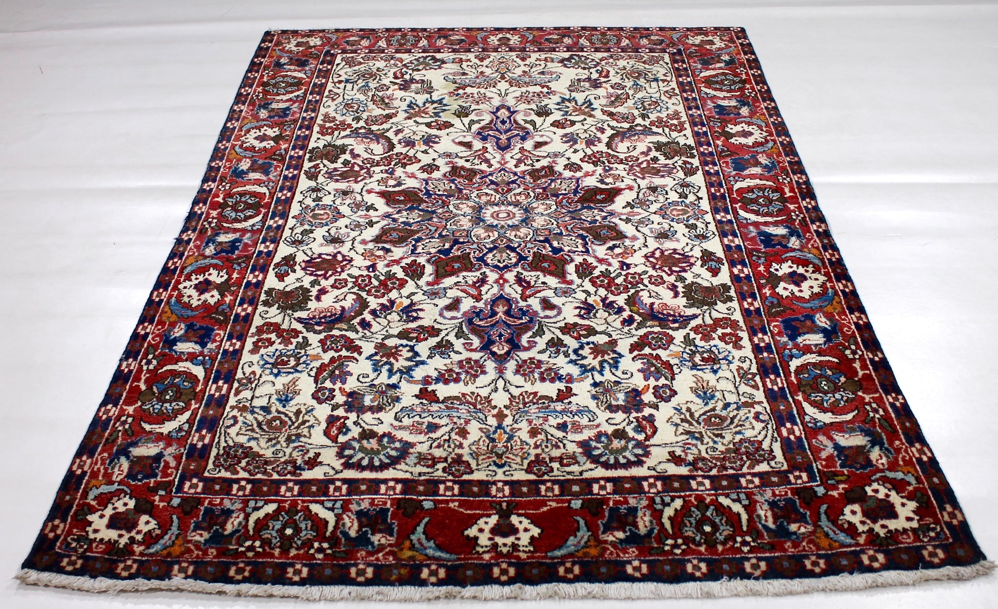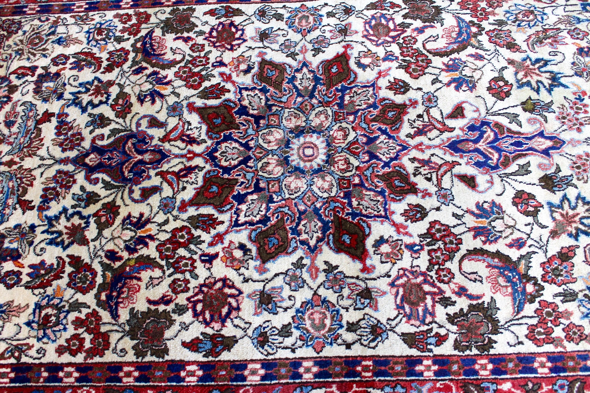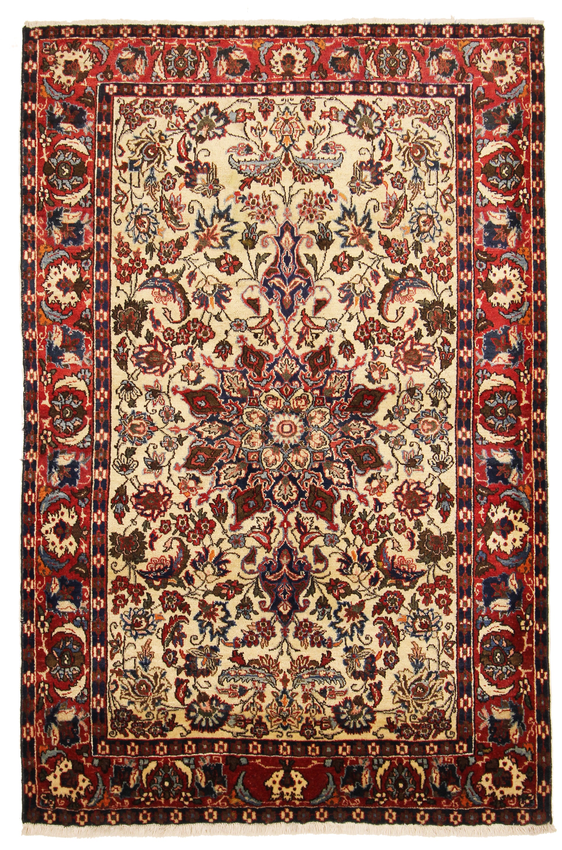 Dieser Khamseh Perserteppich wurde aus hochwertiger Schafwolle von Hand geknüpft. Sie ist das am häufigsten verwendete Material in der Teppichknüpfkunst und bringt eine Reihe beeindruckender Eigenschaften mit sich: