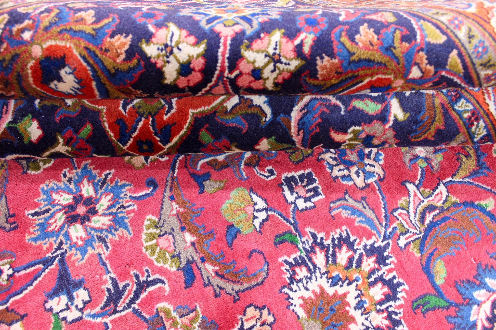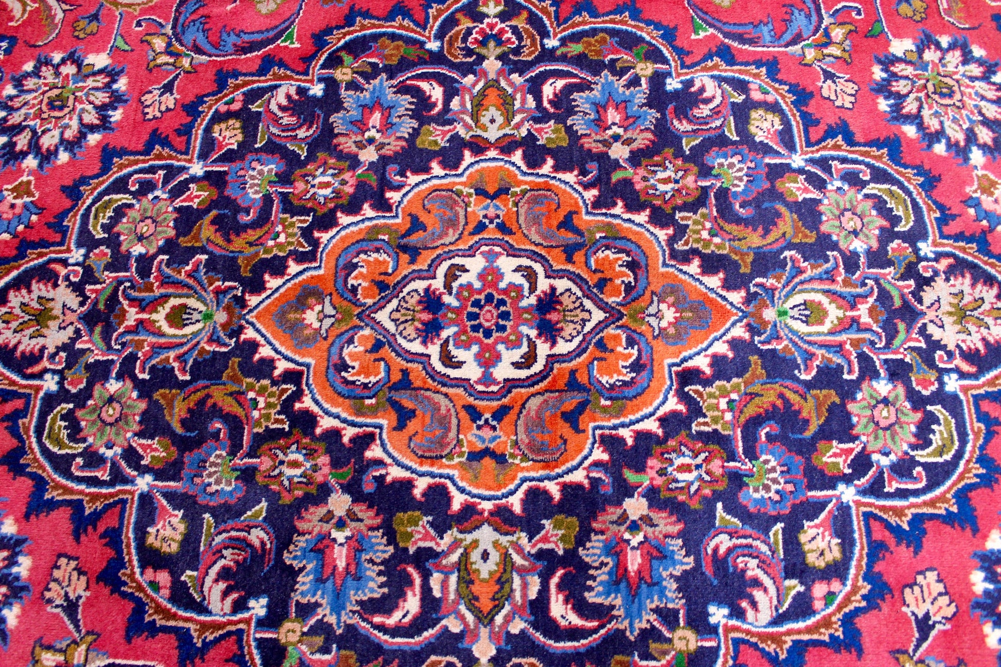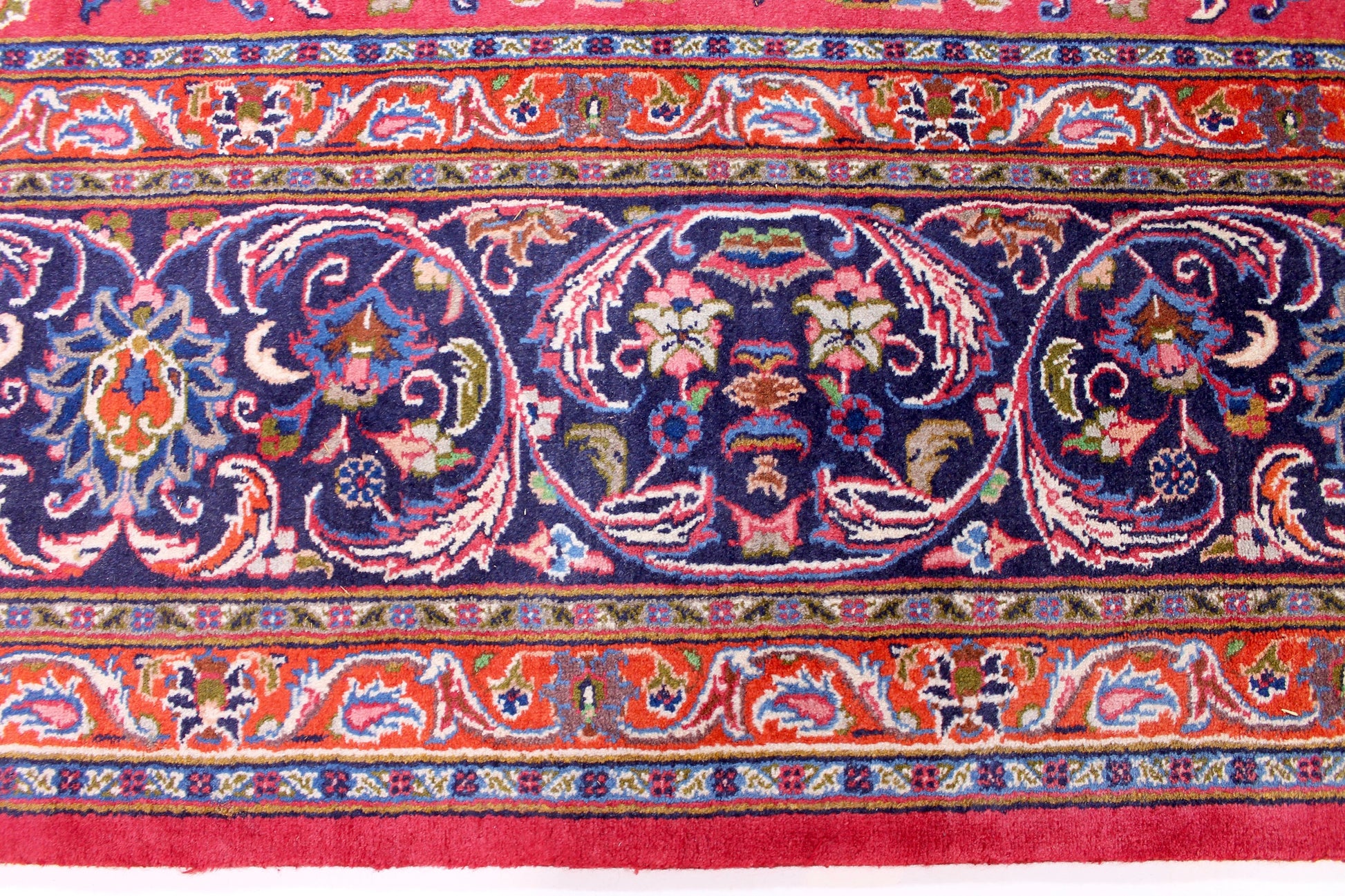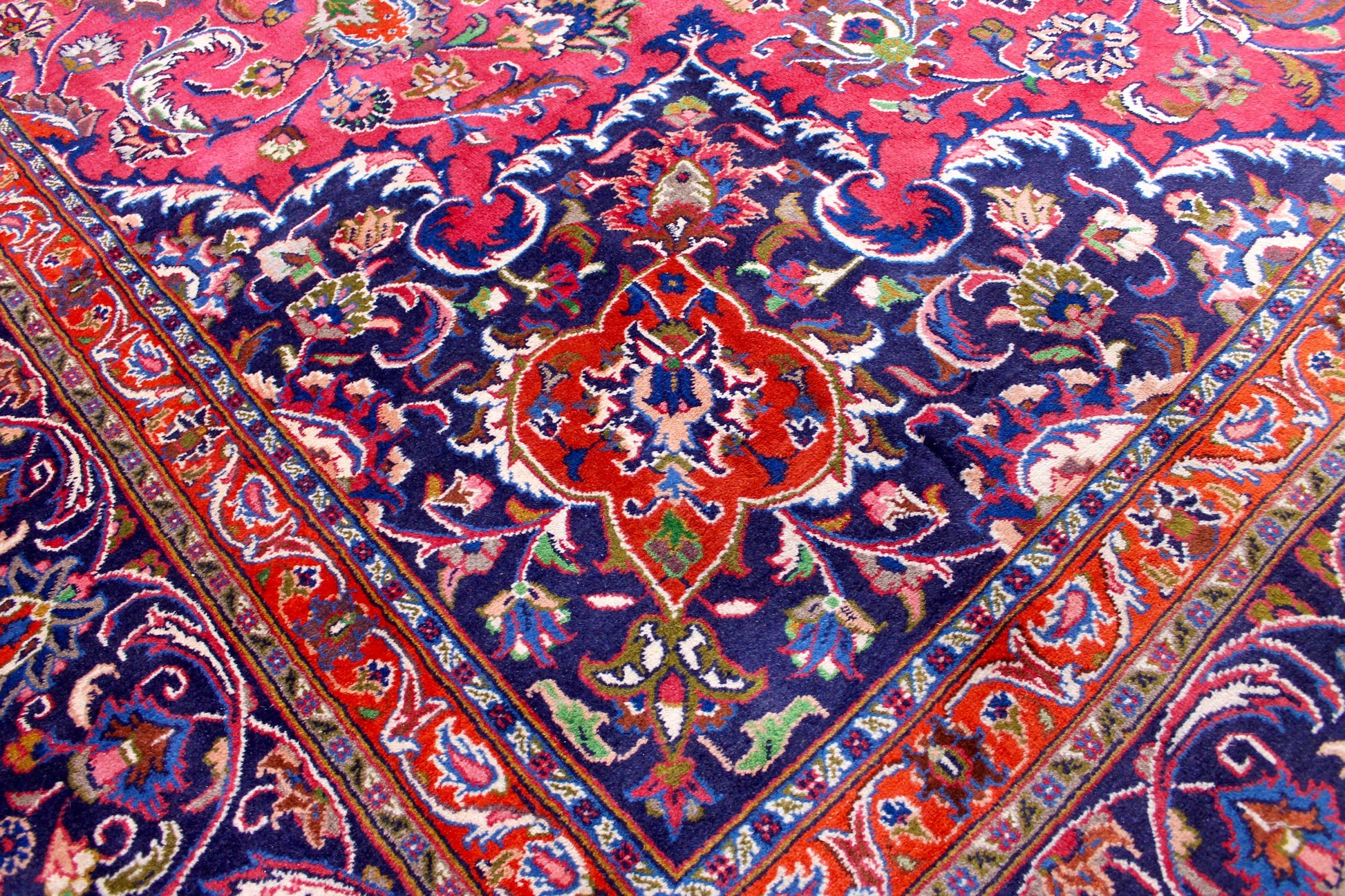 Dieser Teppich aus der Stadt Mashhad wurde aus hochwertiger Schafwolle von Hand geknüpft. Sie ist das am häufigsten verwendete Material in der Teppichknüpfkunst und bringt eine Reihe beeindruckender Eigenschaften mit sich: