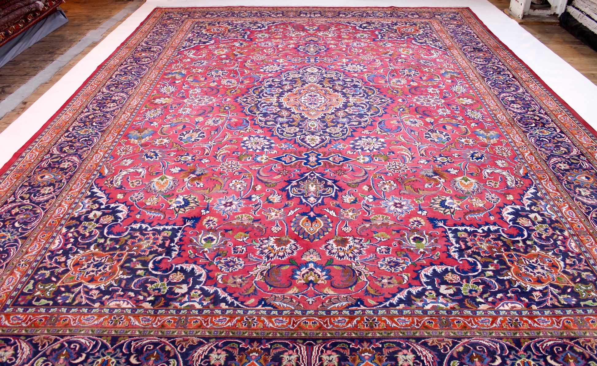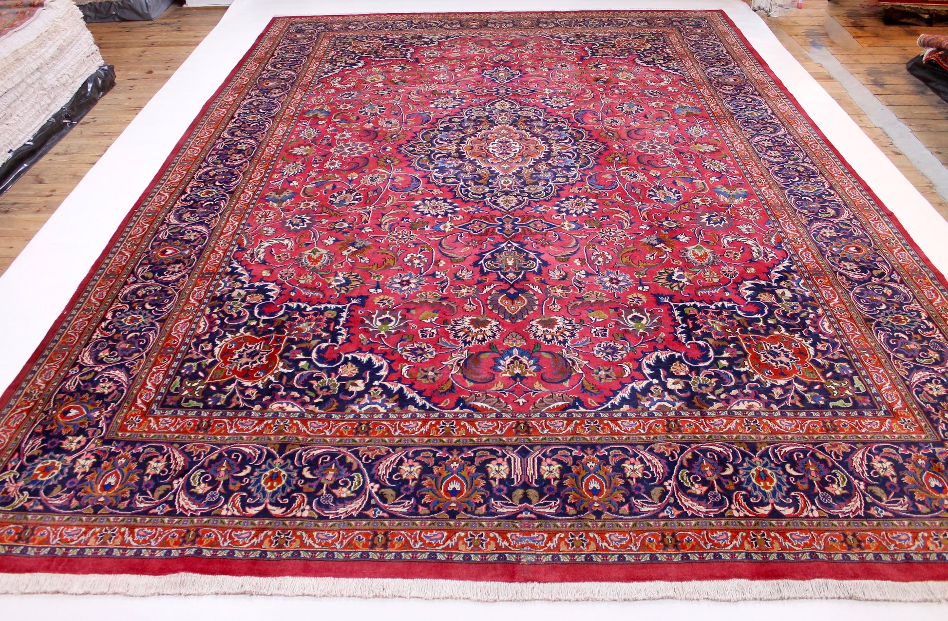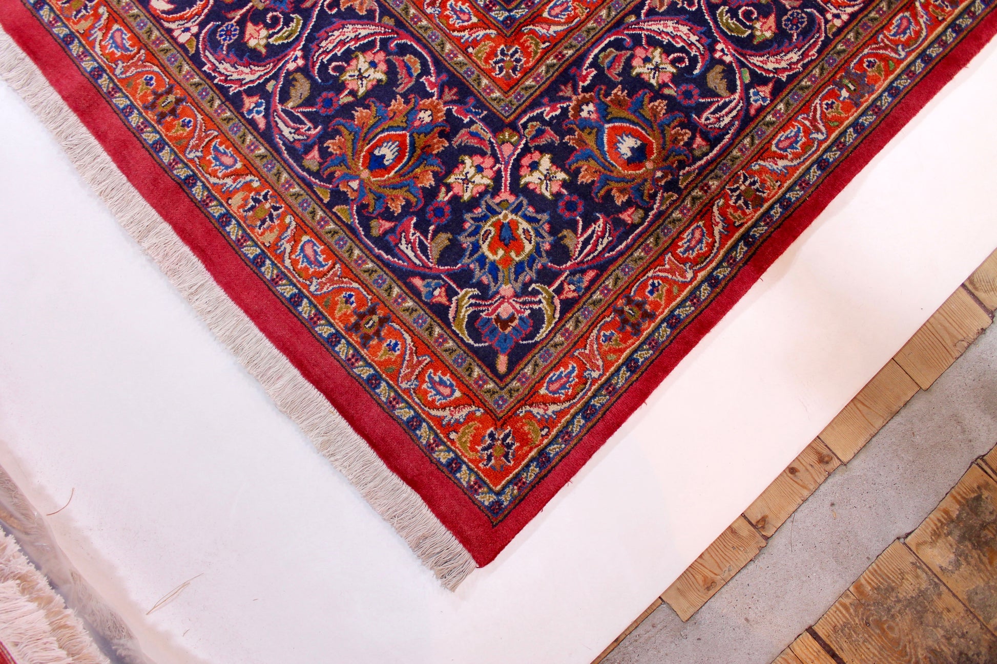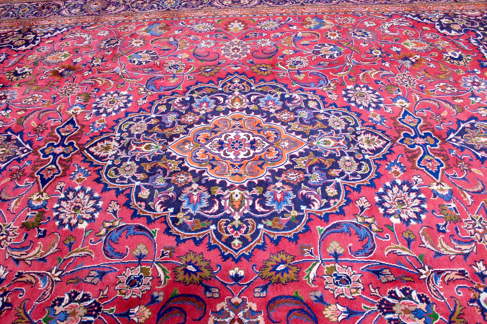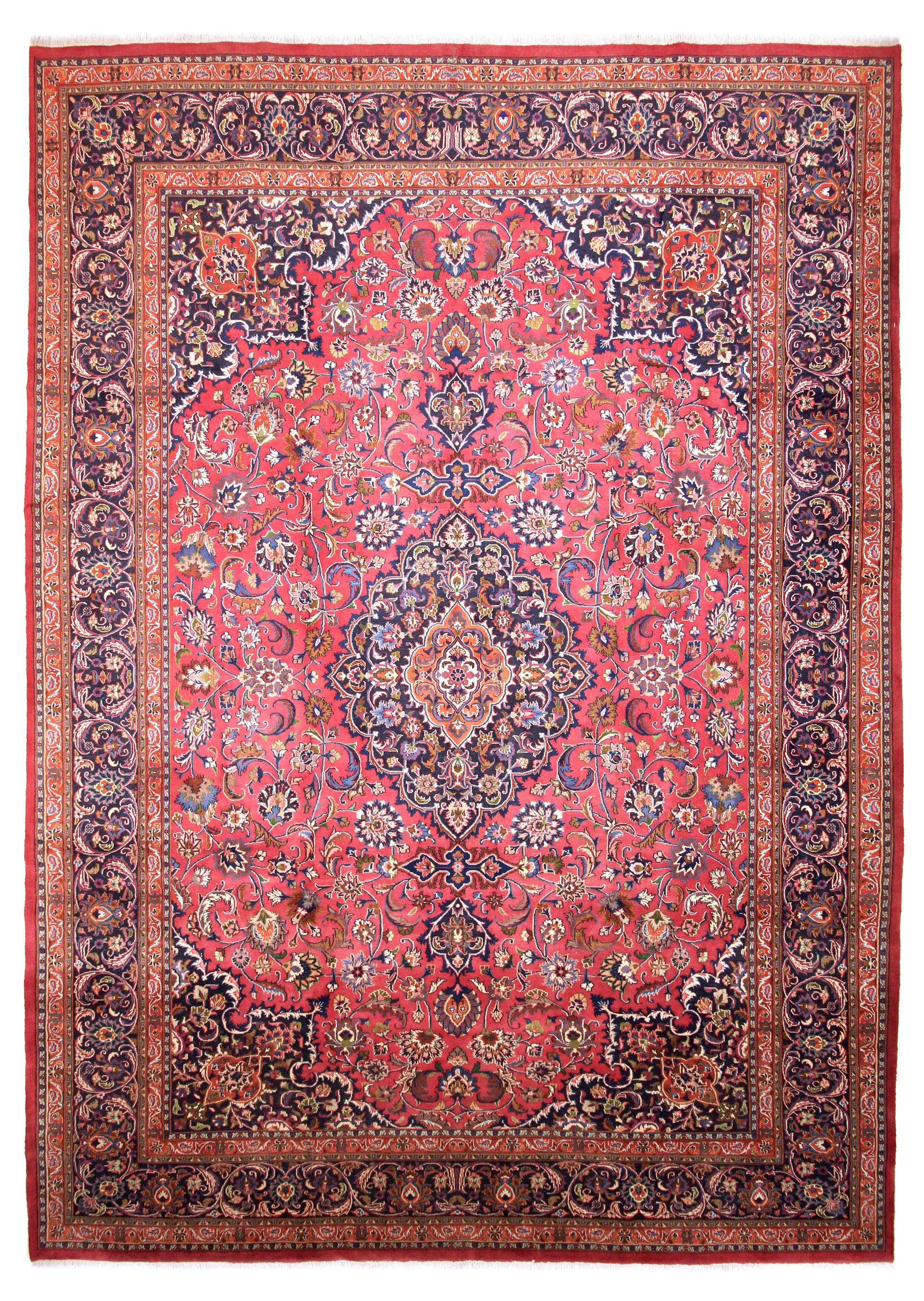 Dieser Teppich aus der Stadt Mashhad wurde aus hochwertiger Schafwolle von Hand geknüpft. Sie ist das am häufigsten verwendete Material in der Teppichknüpfkunst und bringt eine Reihe beeindruckender Eigenschaften mit sich: