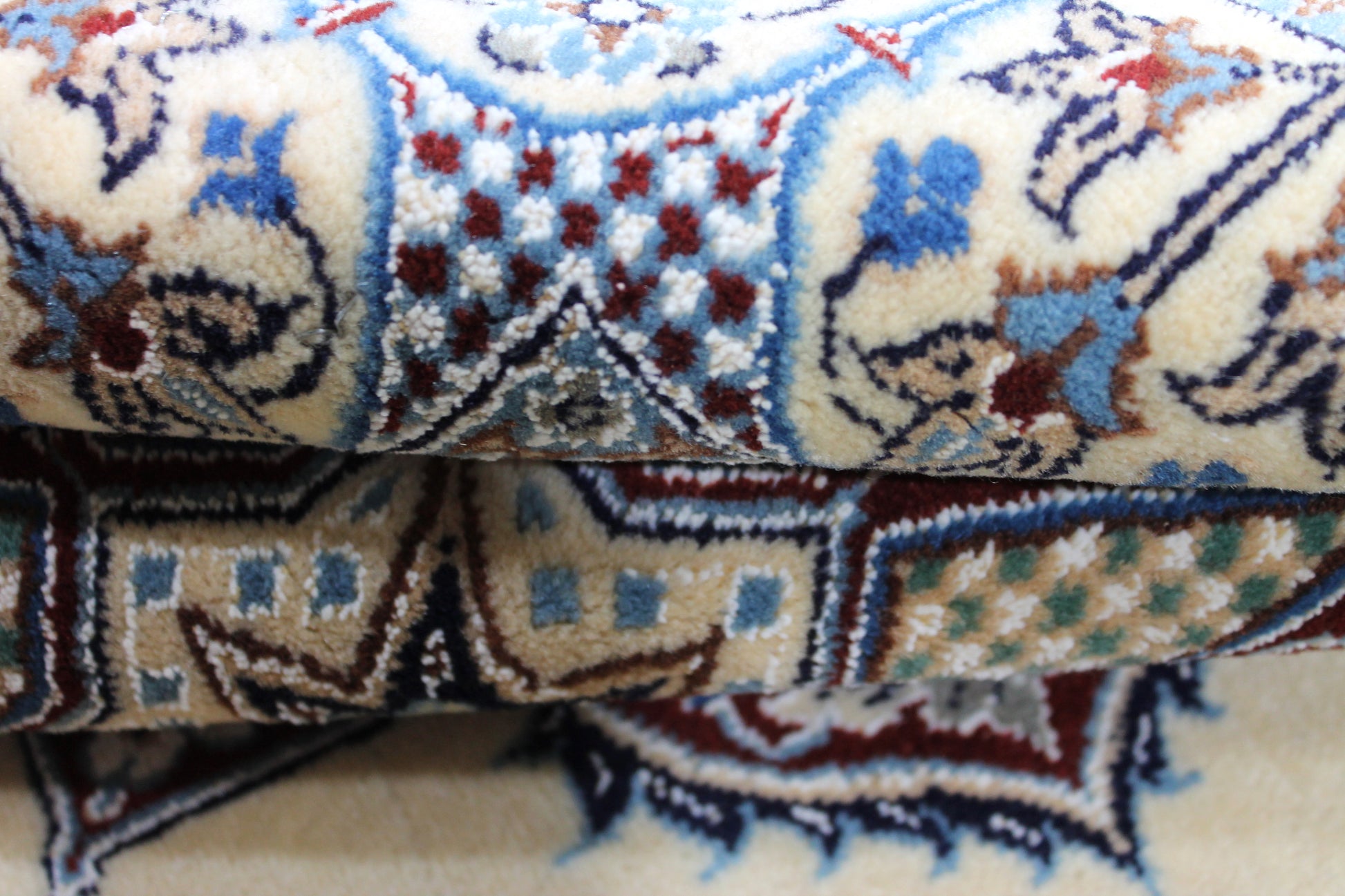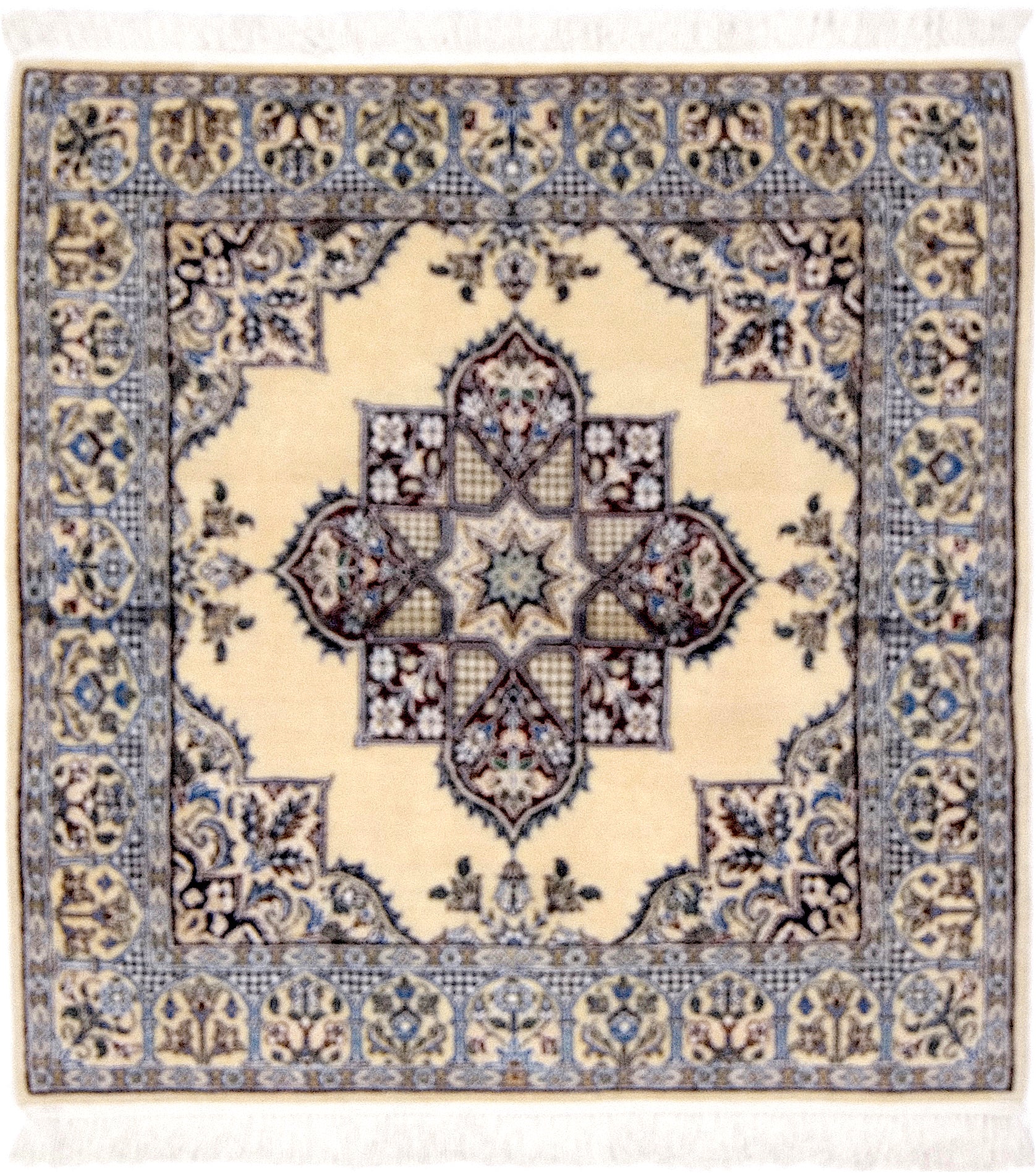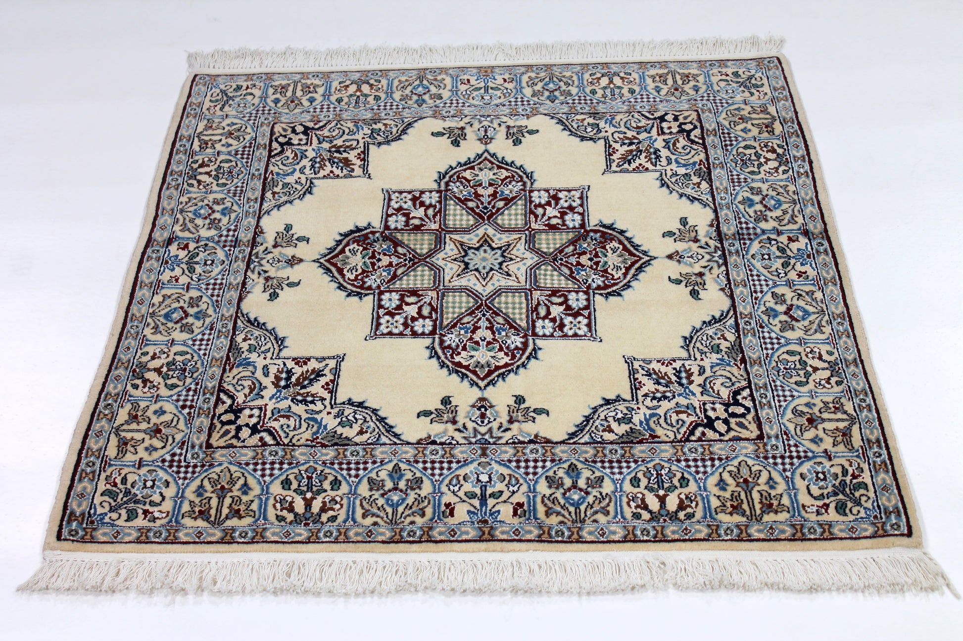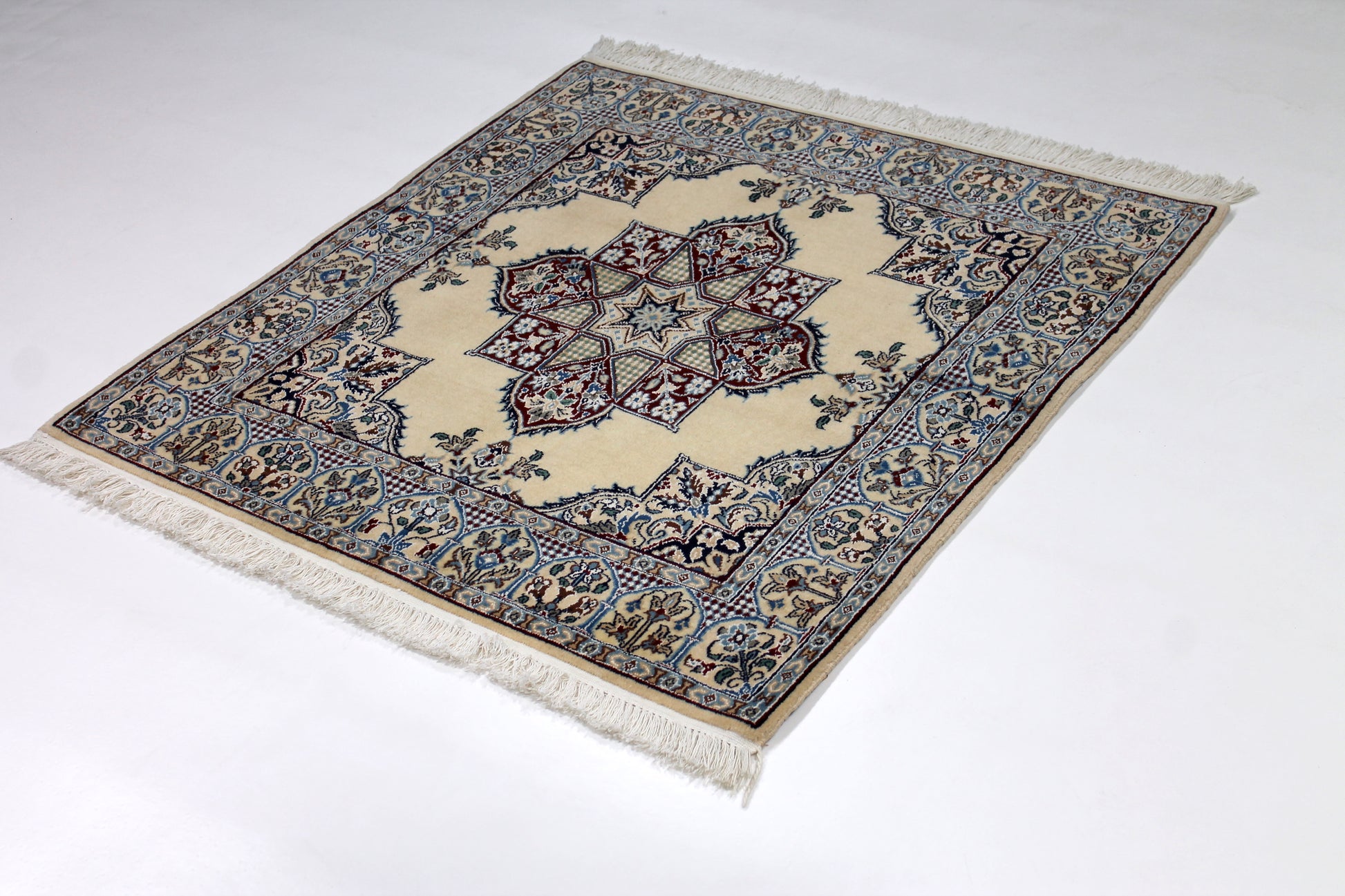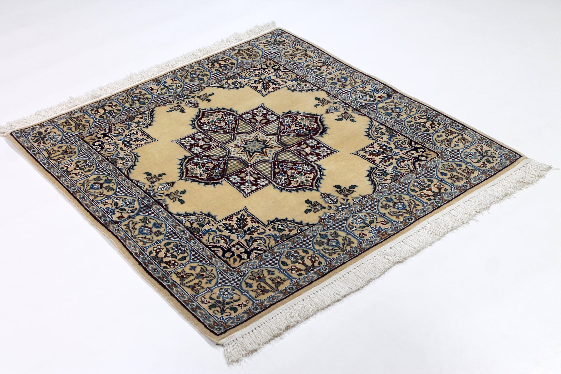 Dieser Nain Teppich wurde aus hochwertiger Schafwolle von Hand geknüpft. Sie ist das am häufigsten verwendete Material in der Teppichknüpfkunst und bringt eine Reihe beeindruckender Eigenschaften mit sich: