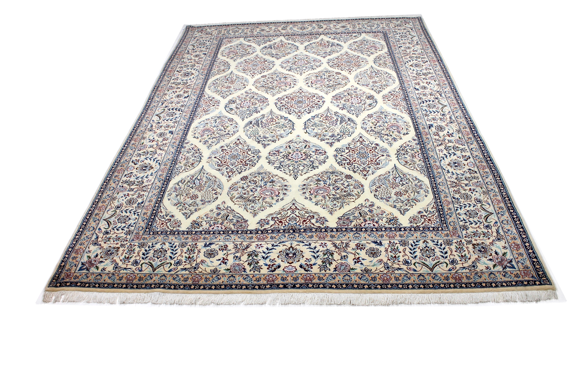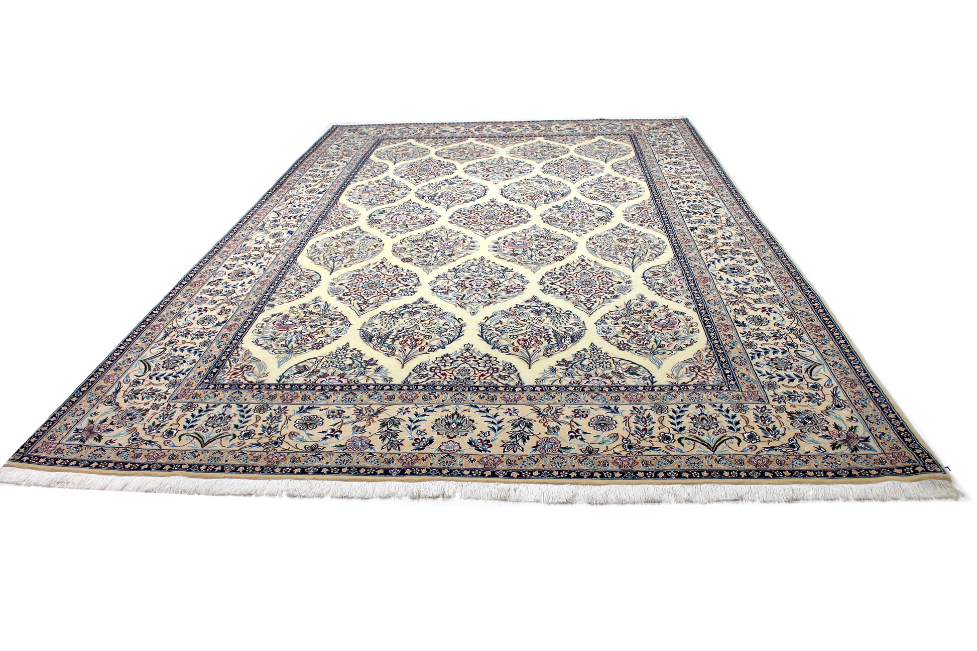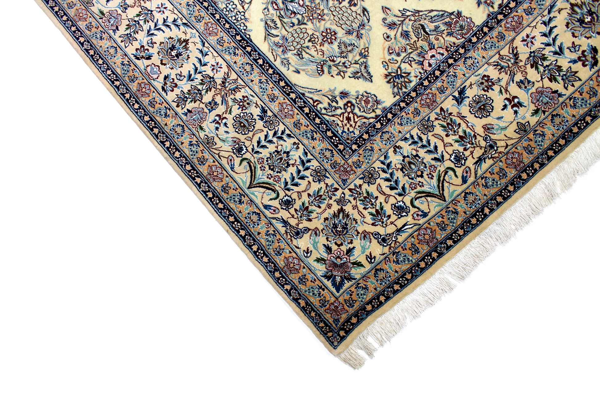 Dieser Nain Teppich wurde aus hochwertiger Schafwolle von Hand geknüpft. Sie ist das am häufigsten verwendete Material in der Teppichknüpfkunst und bringt eine Reihe beeindruckender Eigenschaften mit sich: