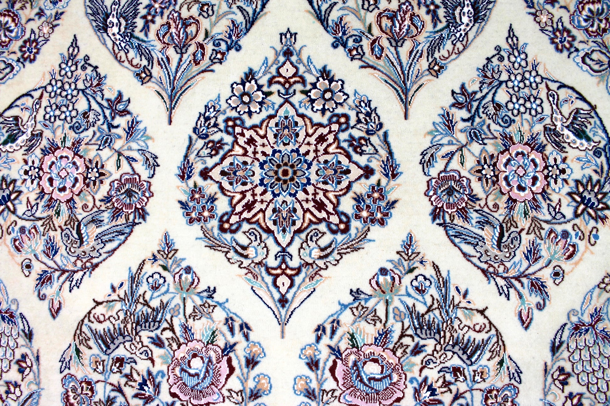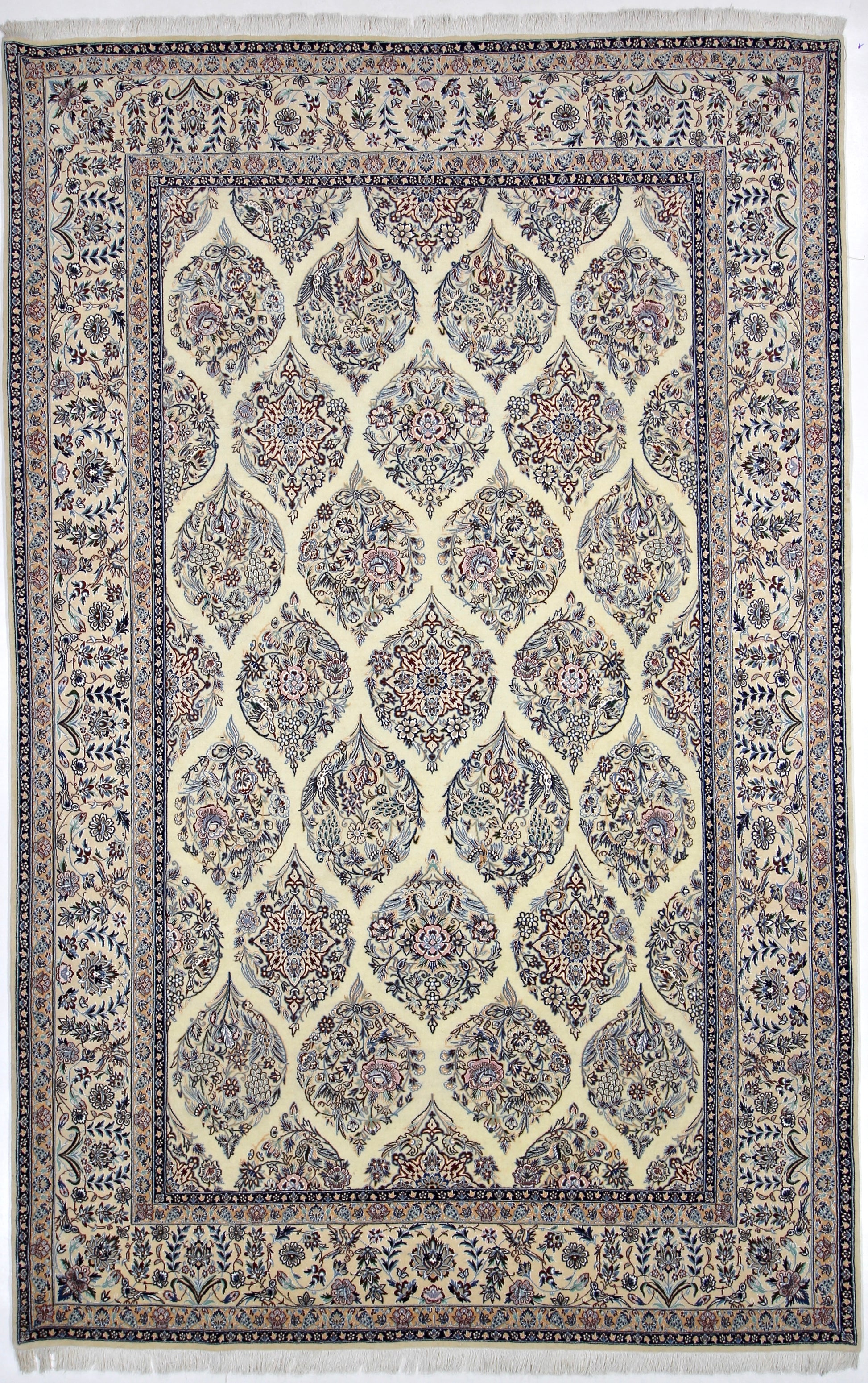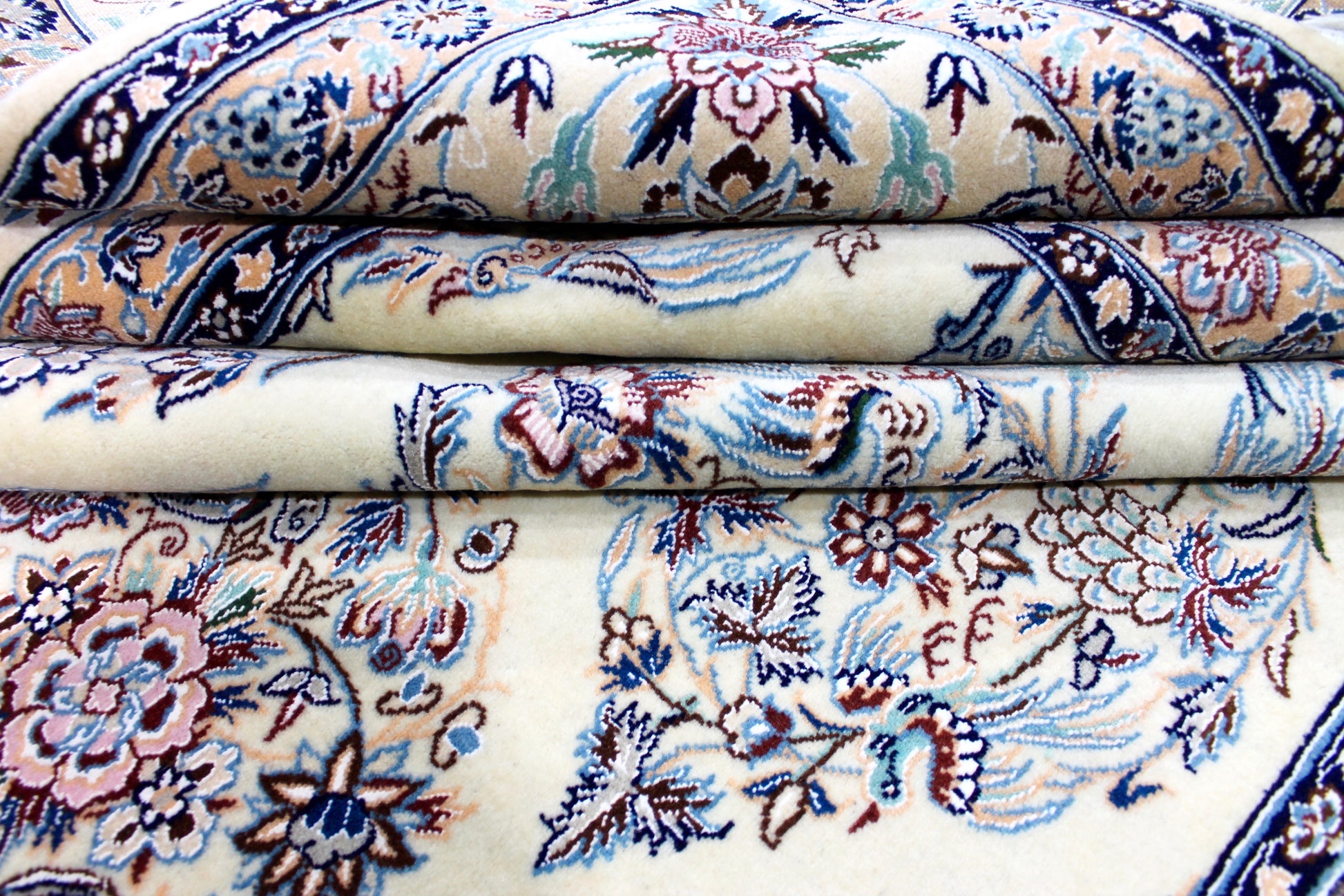 Dieser Nain Teppich wurde aus hochwertiger Schafwolle von Hand geknüpft. Sie ist das am häufigsten verwendete Material in der Teppichknüpfkunst und bringt eine Reihe beeindruckender Eigenschaften mit sich:
