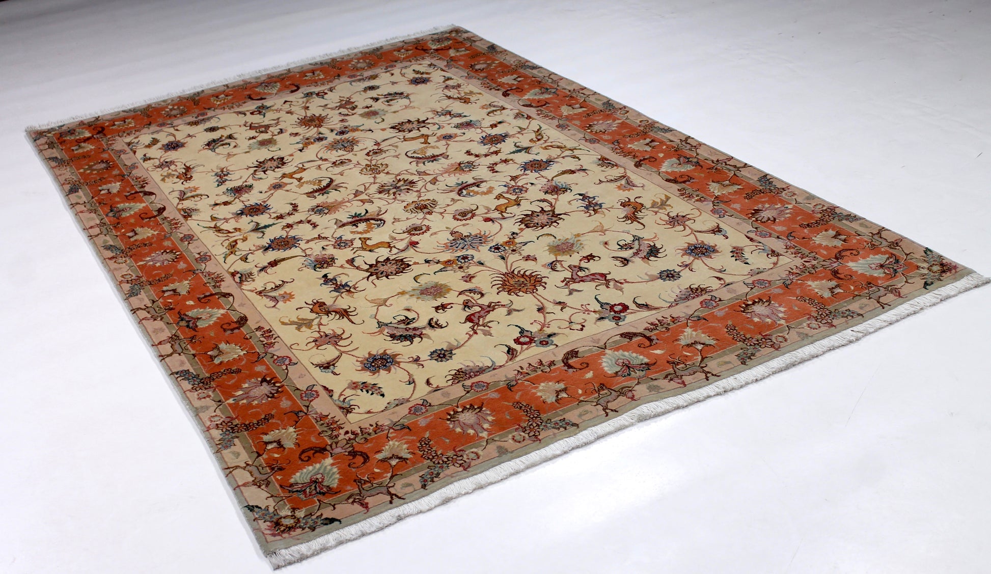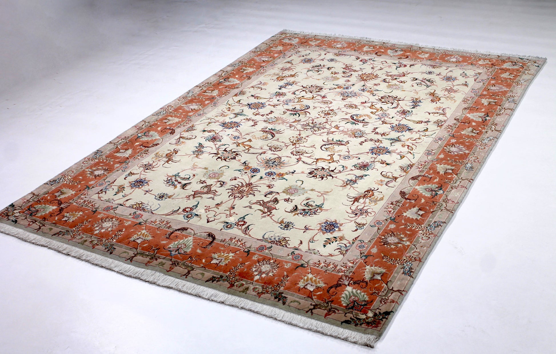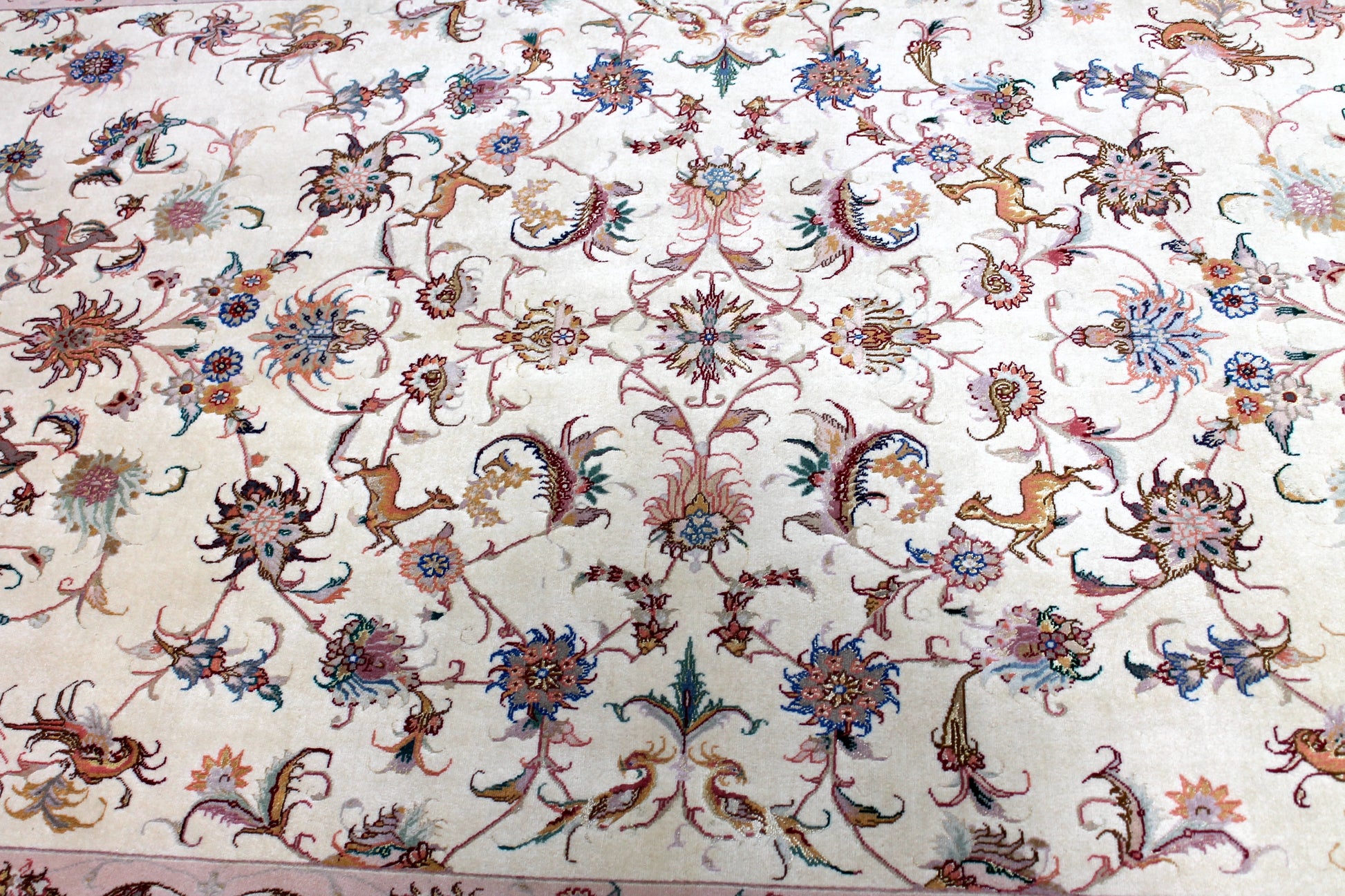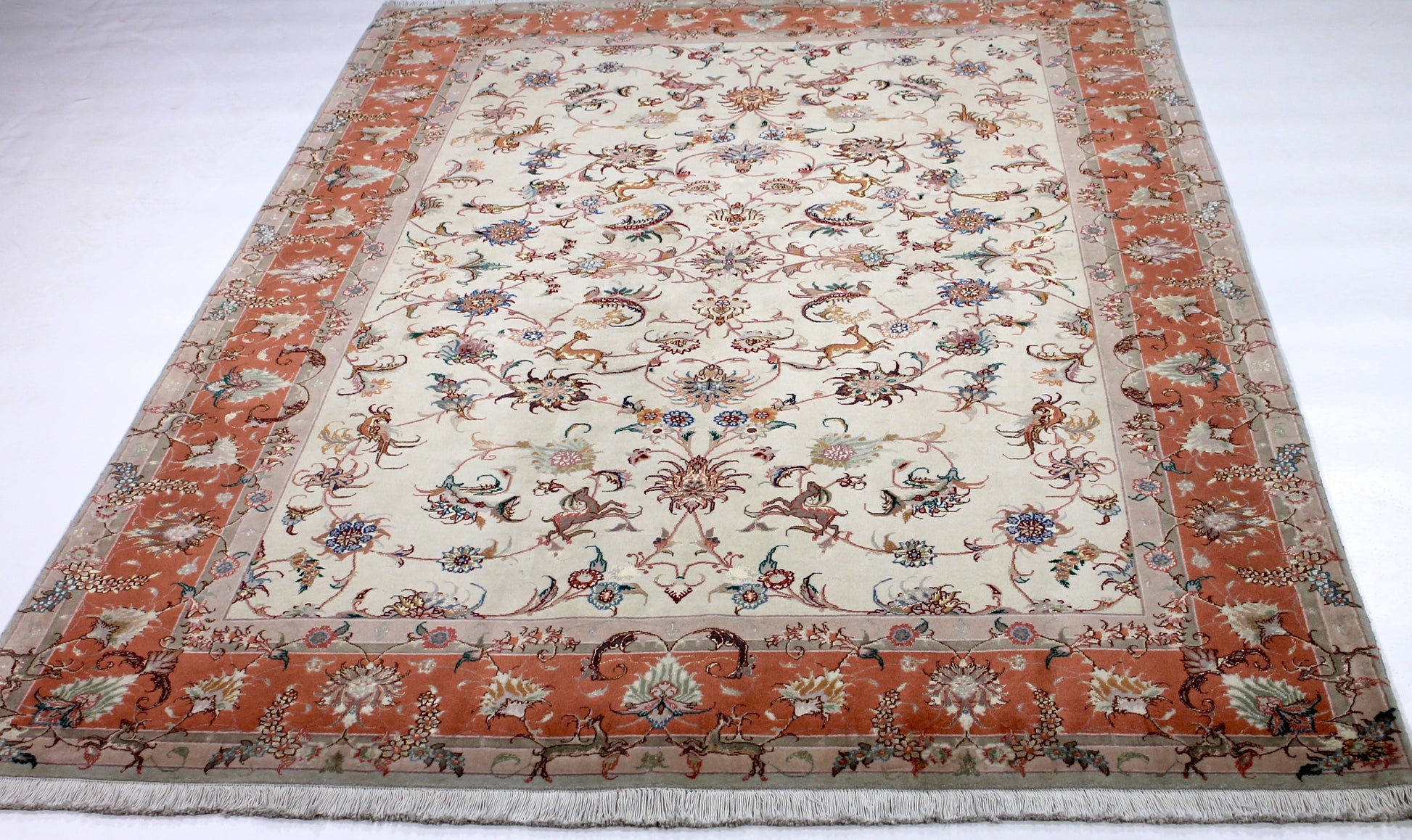 Täbriz Teppiche stammen aus der gleichnamigen Stadt im Nordwesten des Irans. Die Feinheit eines Täbriz definiert sich über den Begriff „Raj“. Er beschreibt die Anzahl der Knoten auf einer Länge von 7cm. Je höher die Raj Zahl und je mehr Seide eingearbeitet ist, desto wertvoller ist der Teppich.