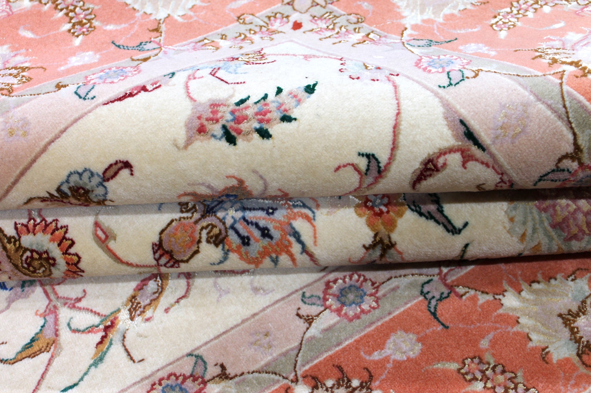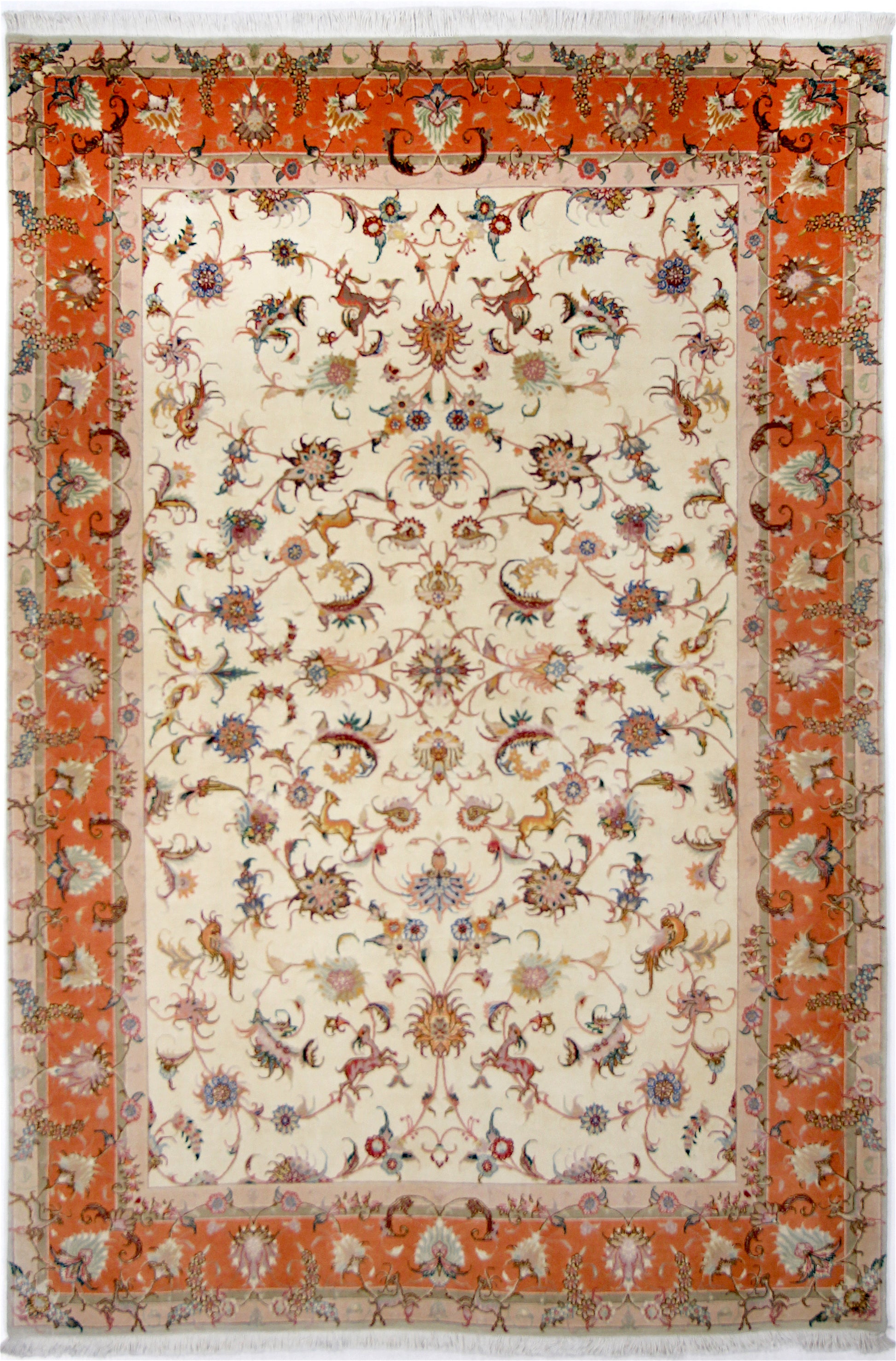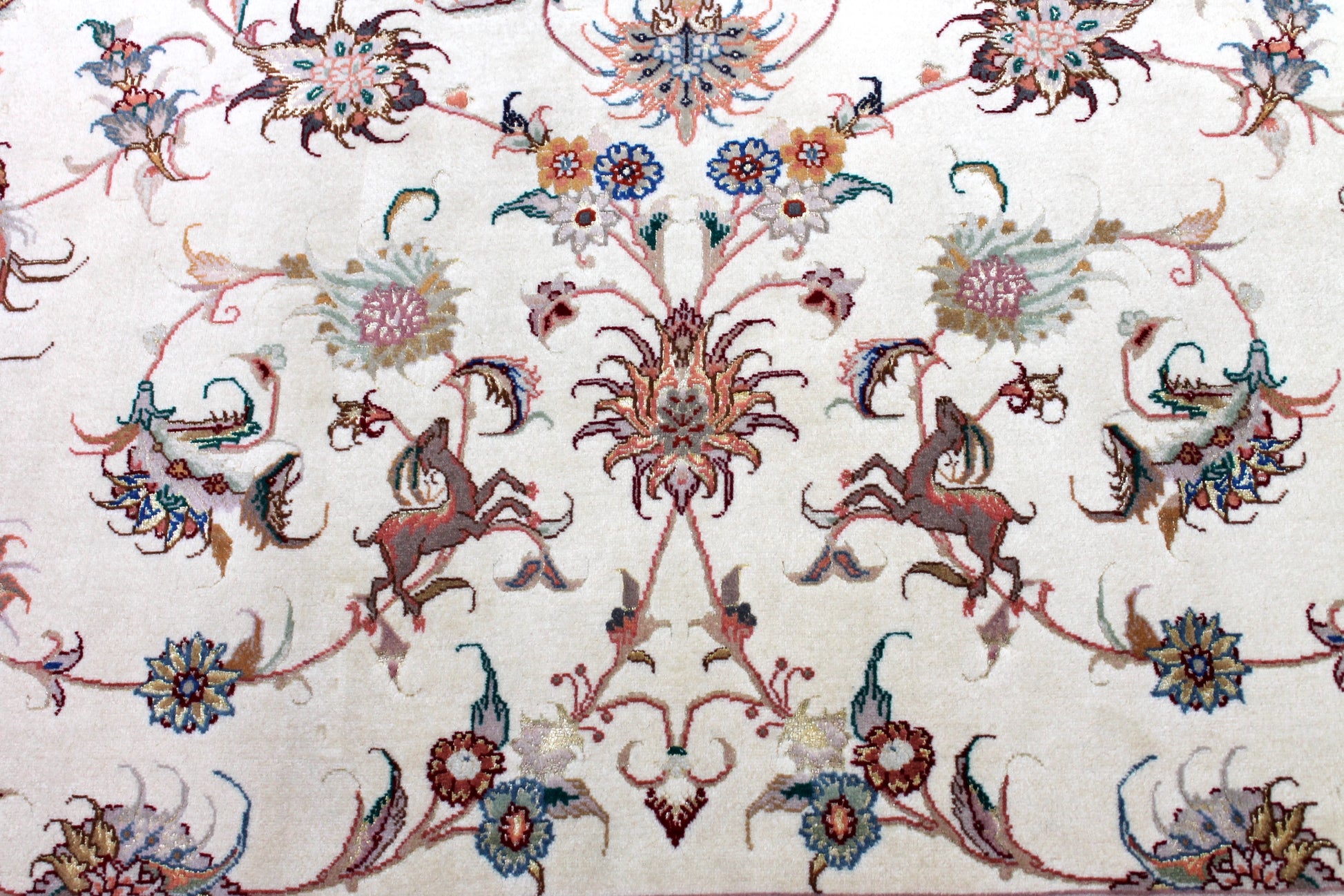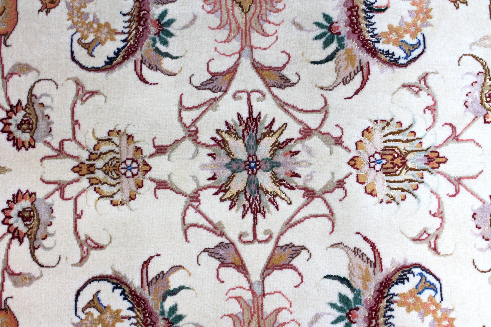 Täbriz Teppiche stammen aus der gleichnamigen Stadt im Nordwesten des Irans. Die Feinheit eines Täbriz definiert sich über den Begriff „Raj“. Er beschreibt die Anzahl der Knoten auf einer Länge von 7cm. Je höher die Raj Zahl und je mehr Seide eingearbeitet ist, desto wertvoller ist der Teppich.