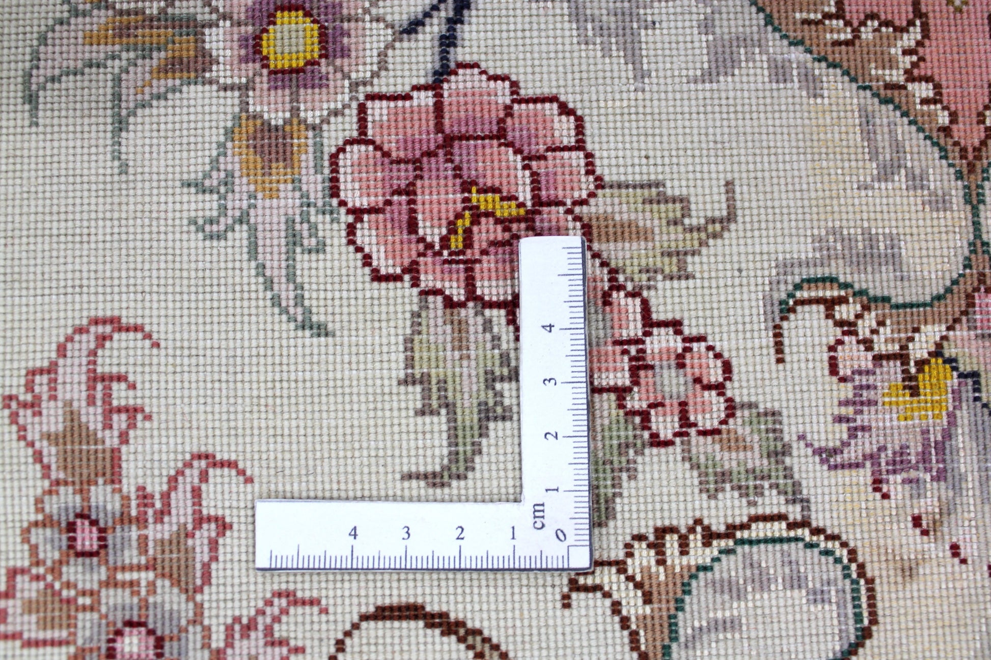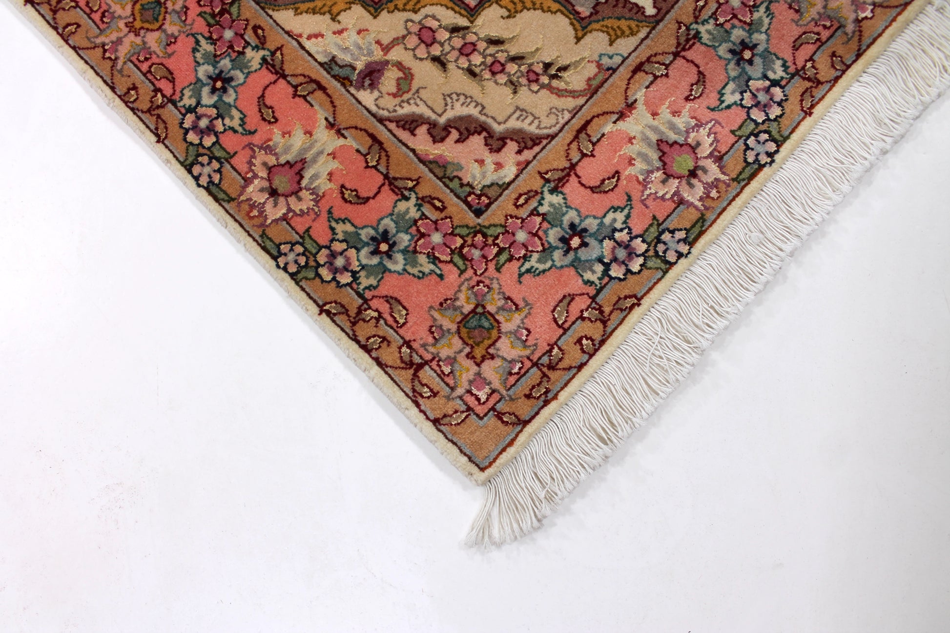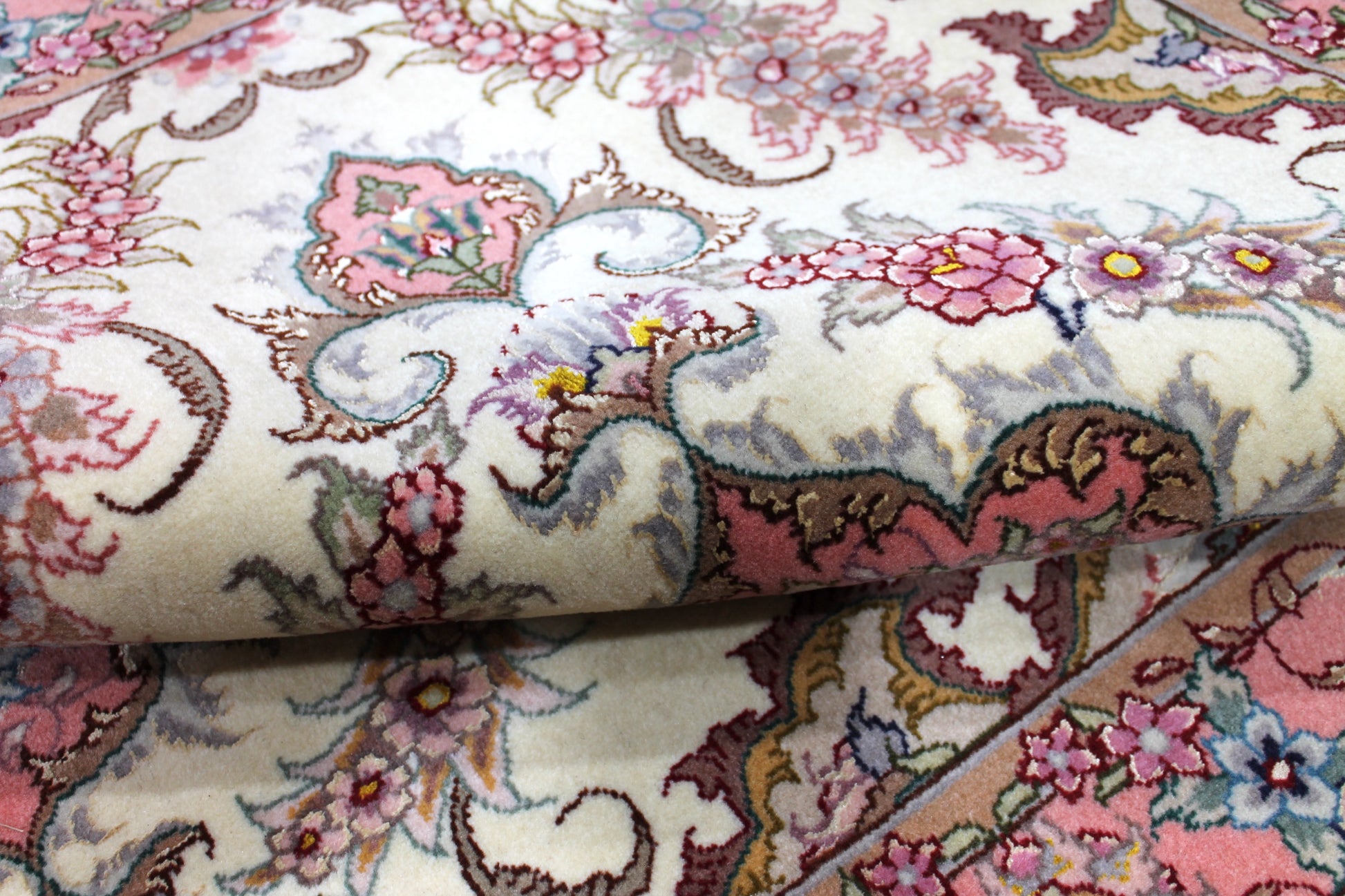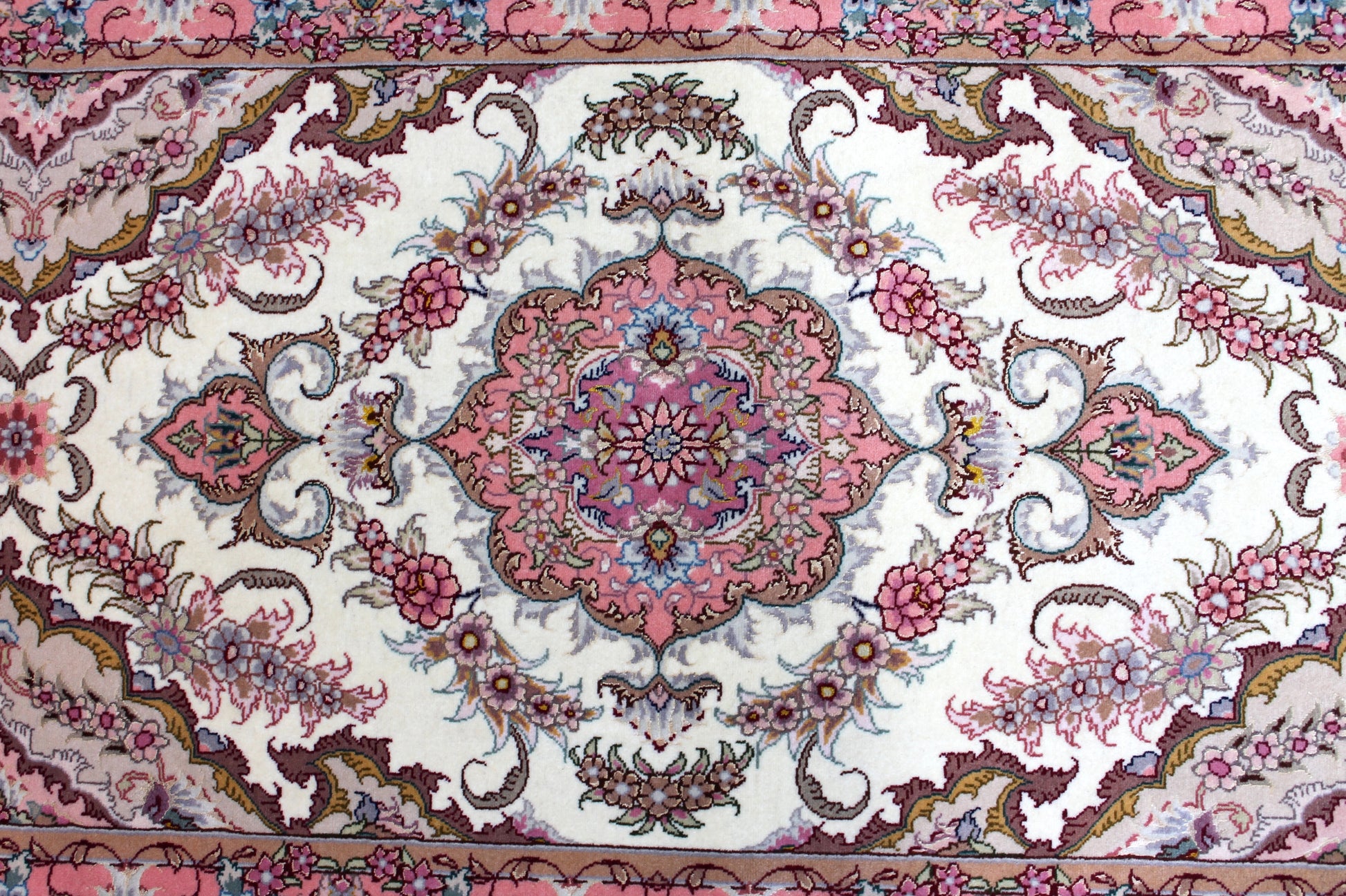 Täbriz Teppiche stammen aus der gleichnamigen Stadt im Nordwesten des Irans. Die Feinheit eines Täbriz definiert sich über den Begriff „Raj“. Er beschreibt die Anzahl der Knoten auf einer Länge von 7cm. Je höher die Raj Zahl und je mehr Seide eingearbeitet ist, desto wertvoller ist der Teppich.