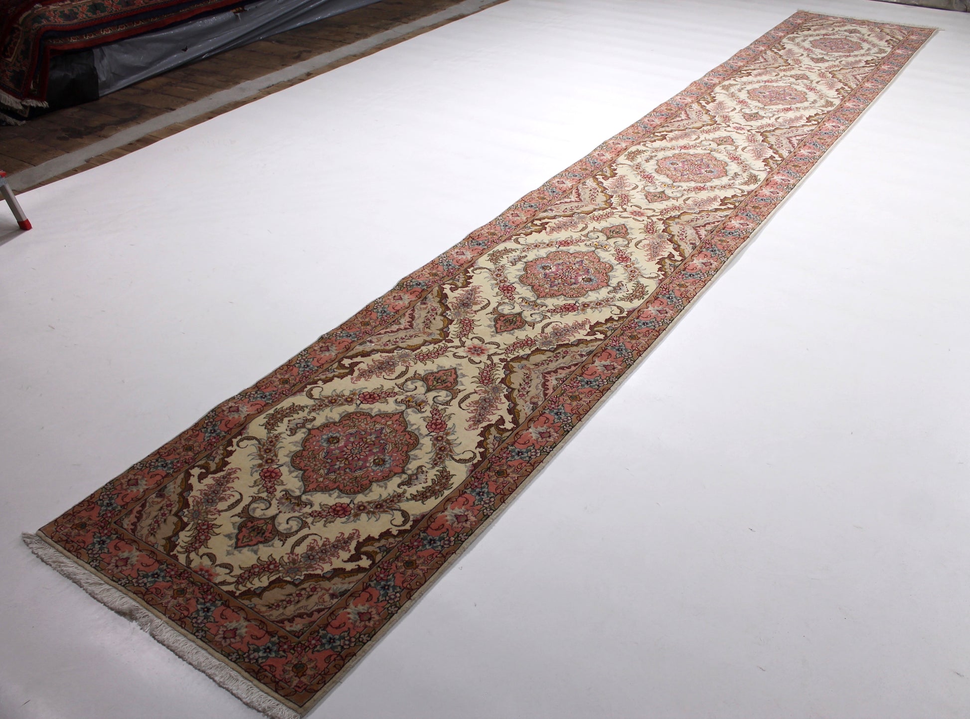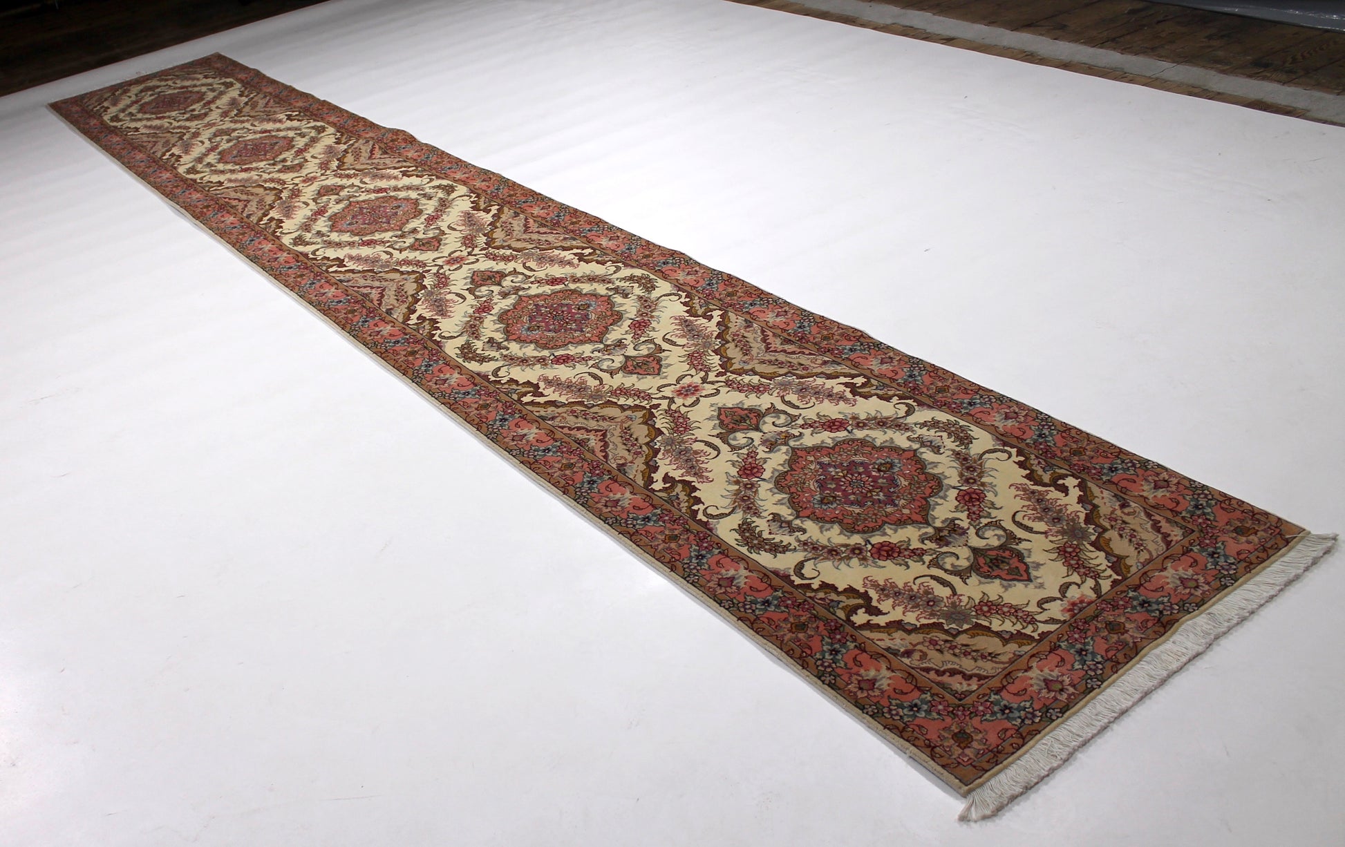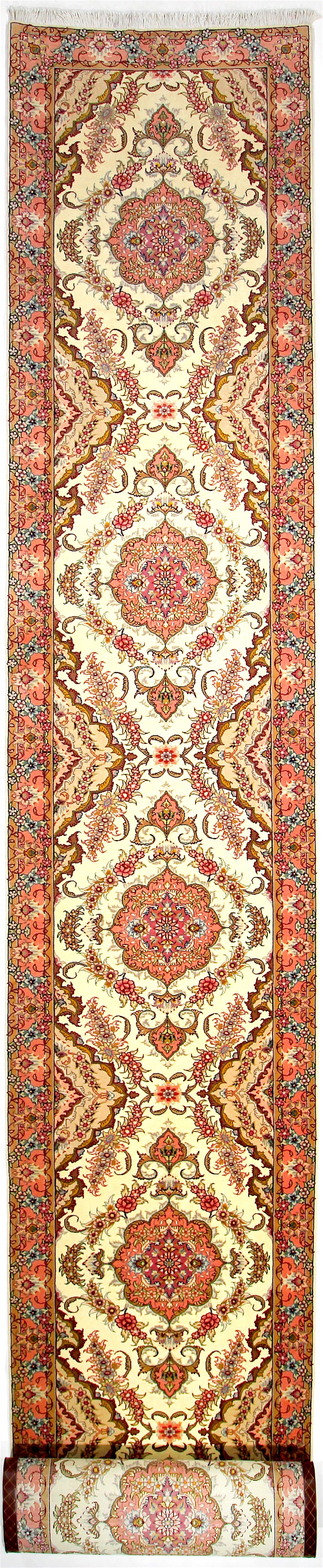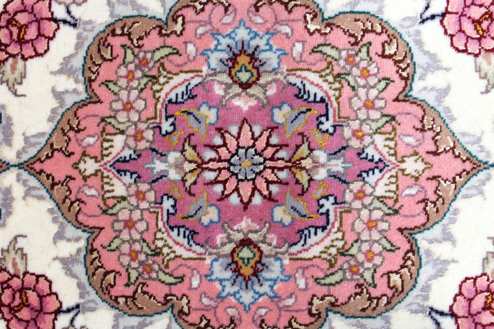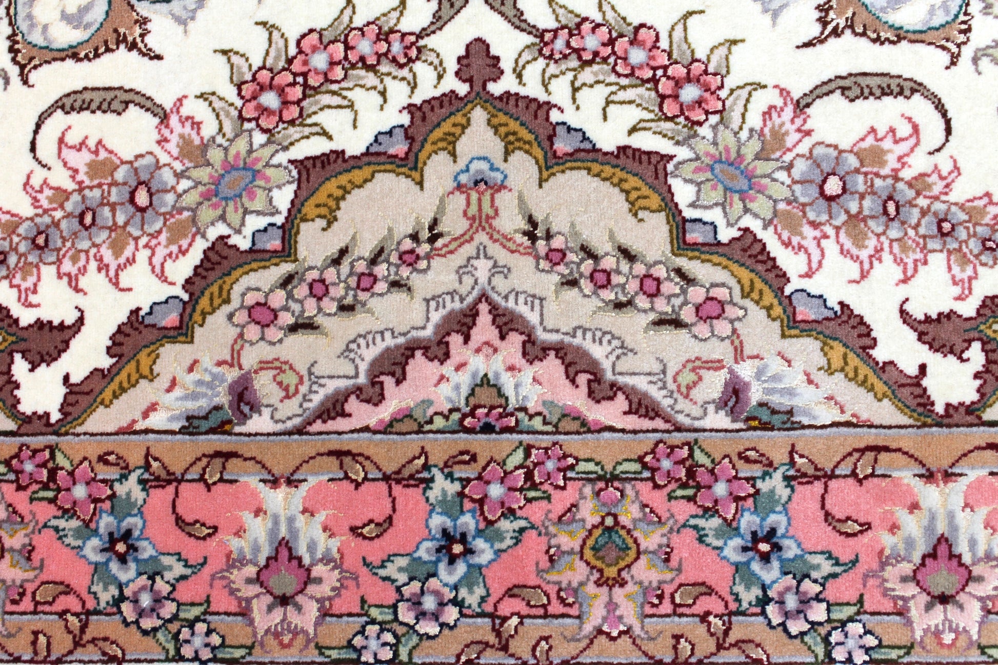 Täbriz Teppiche stammen aus der gleichnamigen Stadt im Nordwesten des Irans. Die Feinheit eines Täbriz definiert sich über den Begriff „Raj“. Er beschreibt die Anzahl der Knoten auf einer Länge von 7cm. Je höher die Raj Zahl und je mehr Seide eingearbeitet ist, desto wertvoller ist der Teppich.