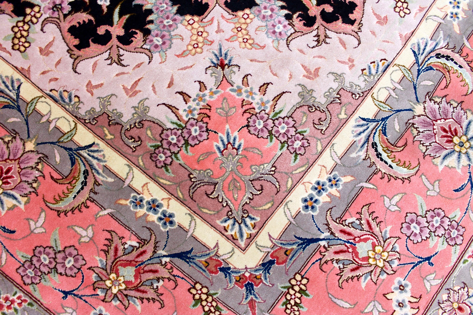 Täbriz Teppiche stammen aus der gleichnamigen Stadt im Nordwesten des Irans. Die Feinheit eines Täbriz definiert sich über den Begriff „Raj“. Er beschreibt die Anzahl der Knoten auf einer Länge von 7cm. Je höher die Raj Zahl und je mehr Seide eingearbeitet ist, desto wertvoller ist der Teppich.