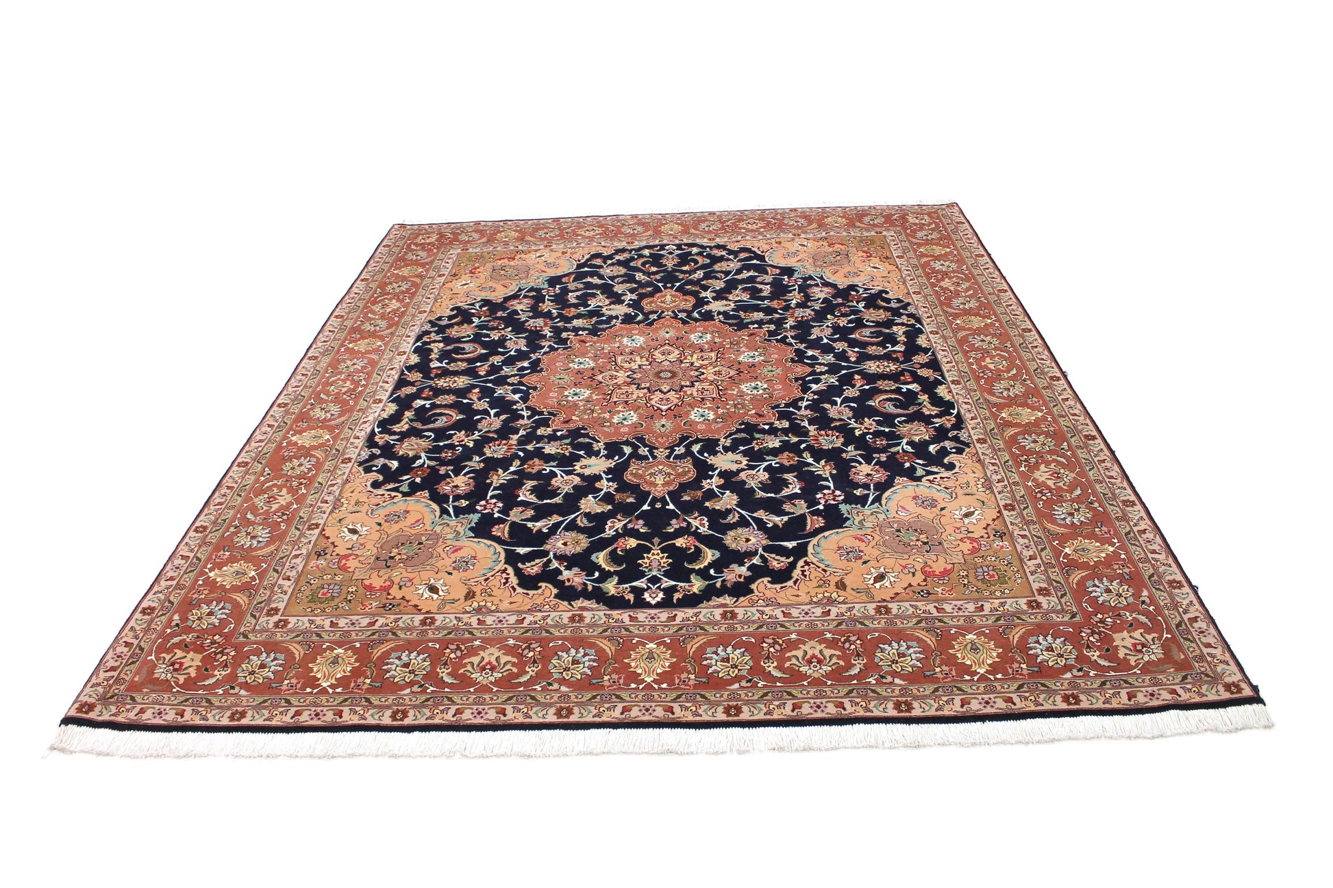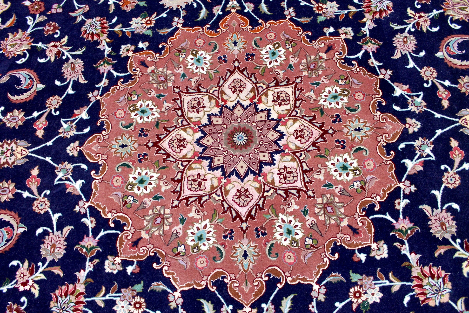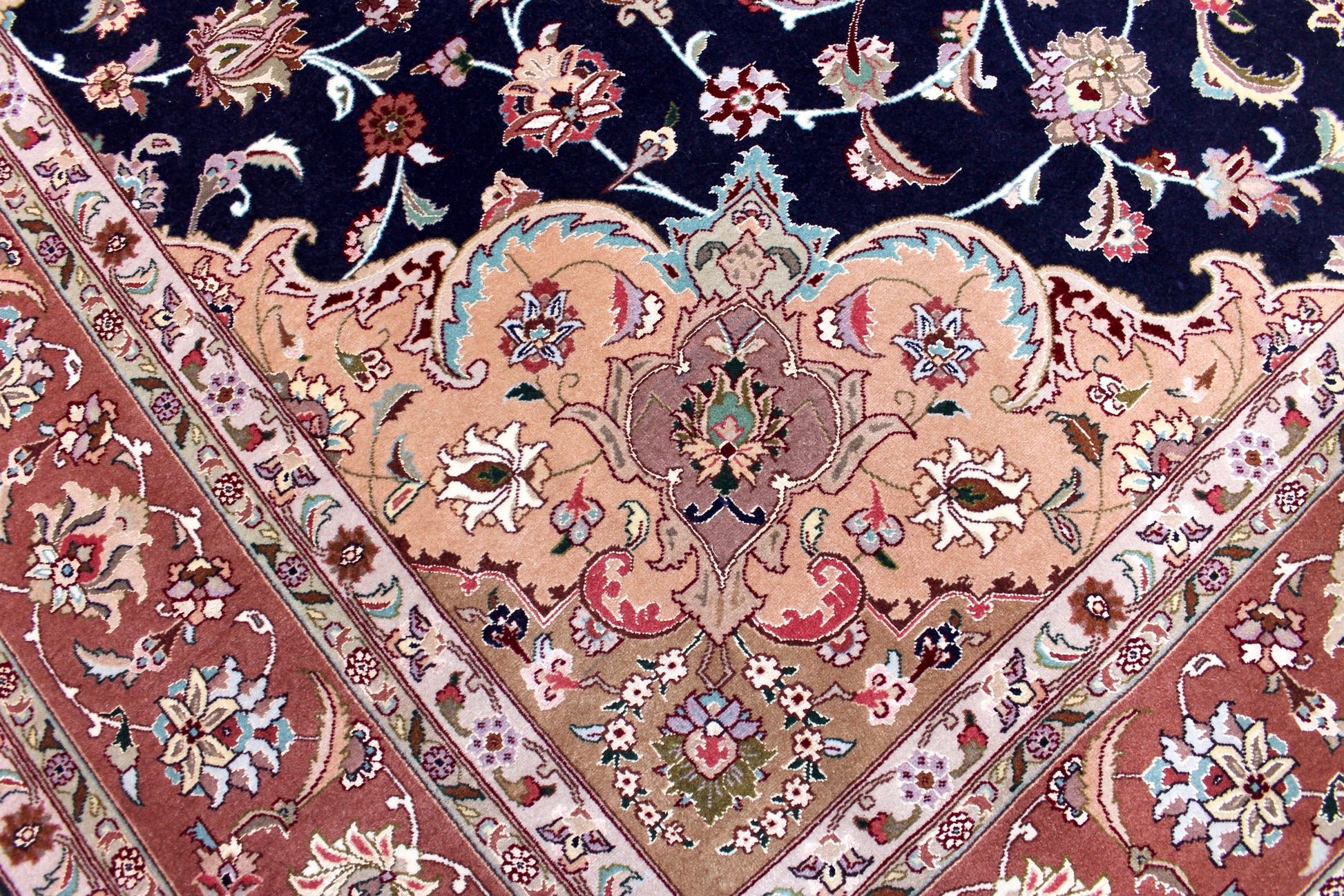 Täbriz Teppiche stammen aus der gleichnamigen Stadt im Nordwesten des Irans. Die Feinheit eines Täbriz definiert sich über den Begriff „Raj“. Er beschreibt die Anzahl der Knoten auf einer Länge von 7cm. Je höher die Raj Zahl und je mehr Seide eingearbeitet ist, desto wertvoller ist der Teppich.