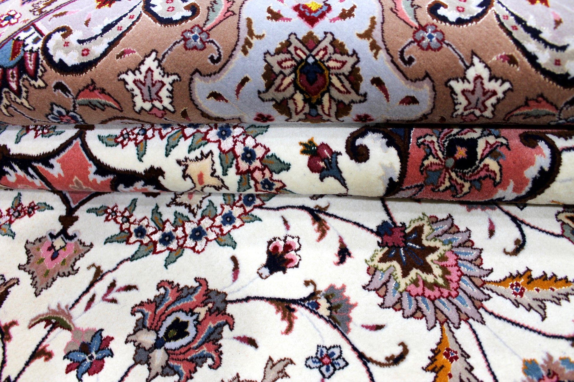 Täbriz Teppiche stammen aus der gleichnamigen Stadt im Nordwesten des Irans. Die Feinheit eines Täbriz definiert sich über den Begriff „Raj“. Er beschreibt die Anzahl der Knoten auf einer Länge von 7cm. Je höher die Raj Zahl und je mehr Seide eingearbeitet ist, desto wertvoller ist der Teppich.