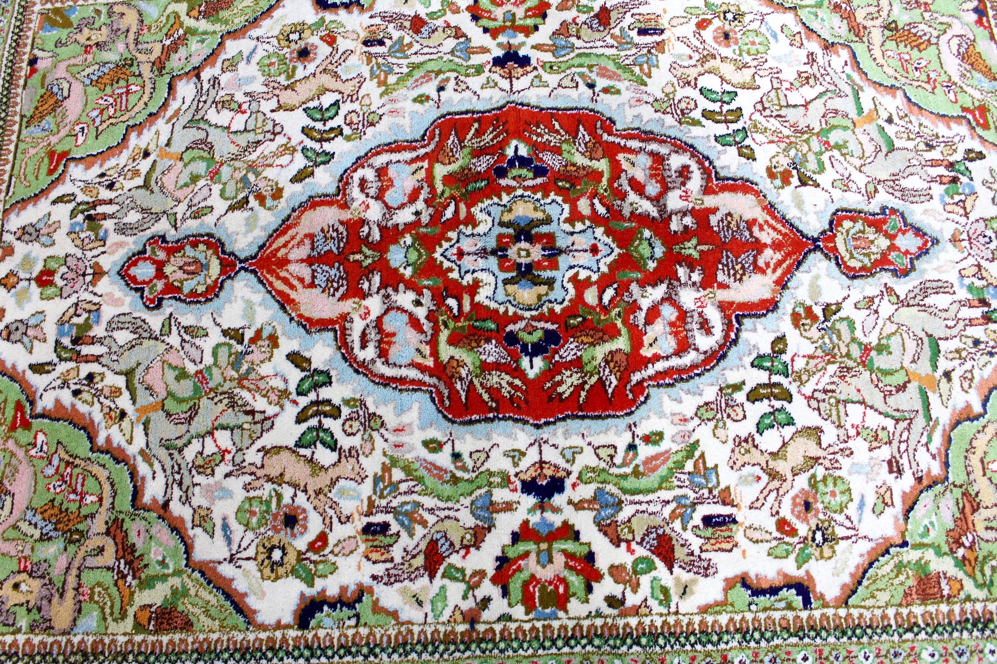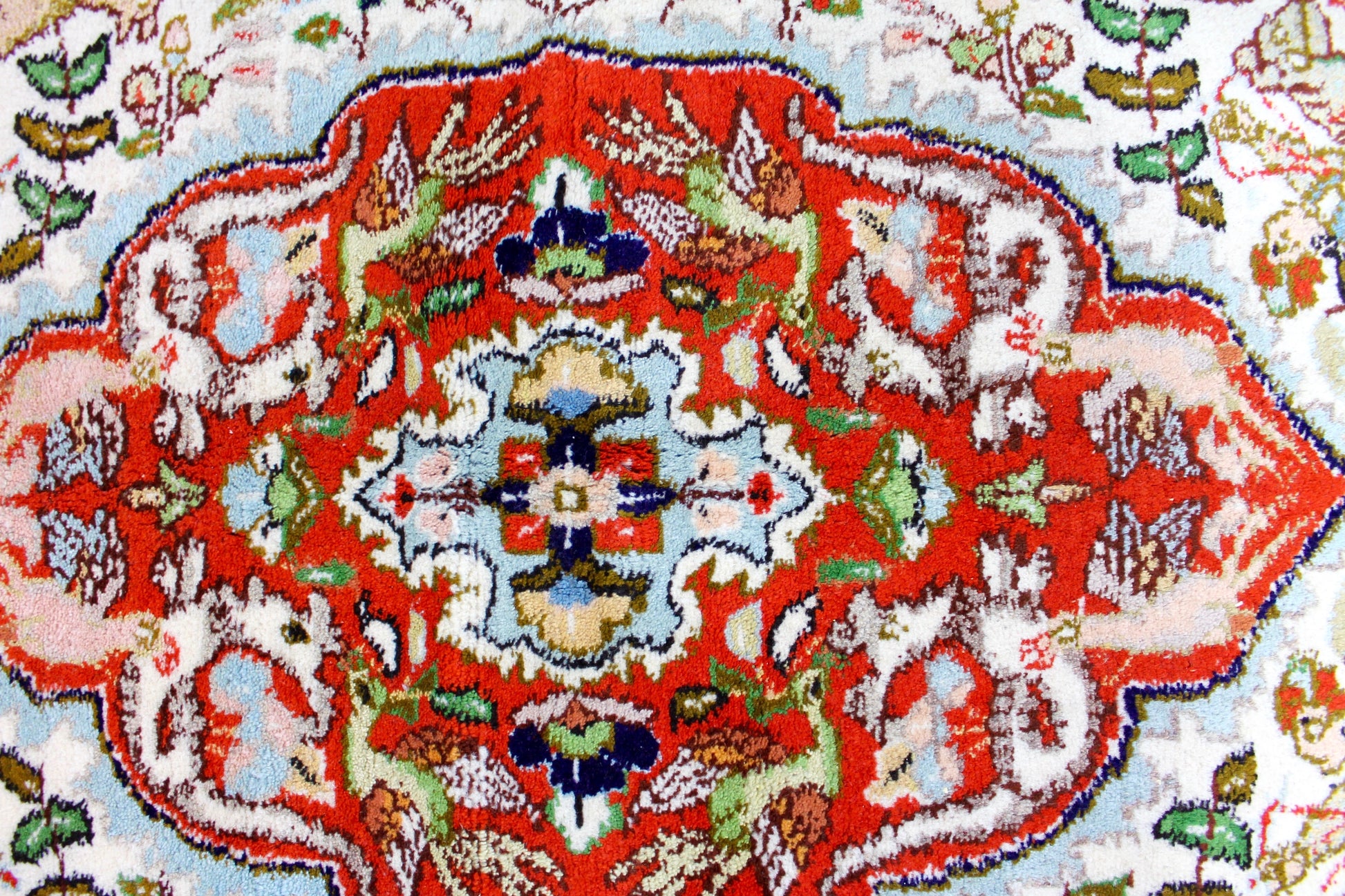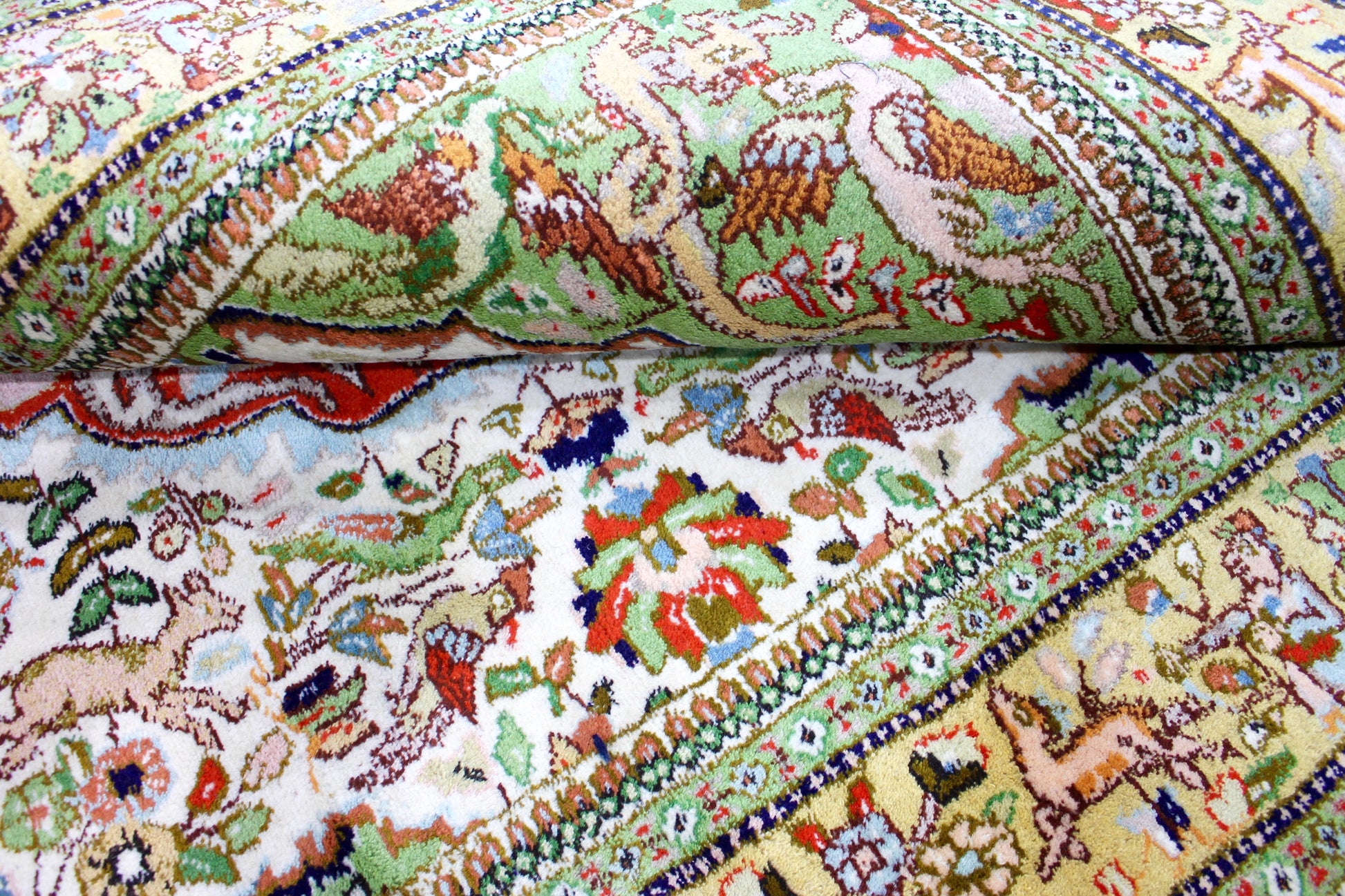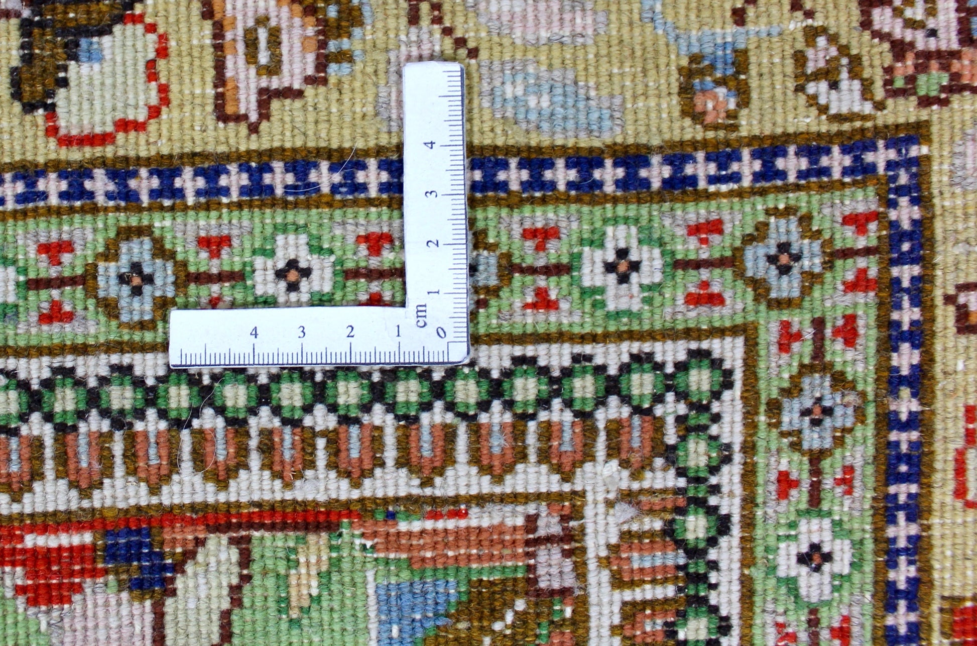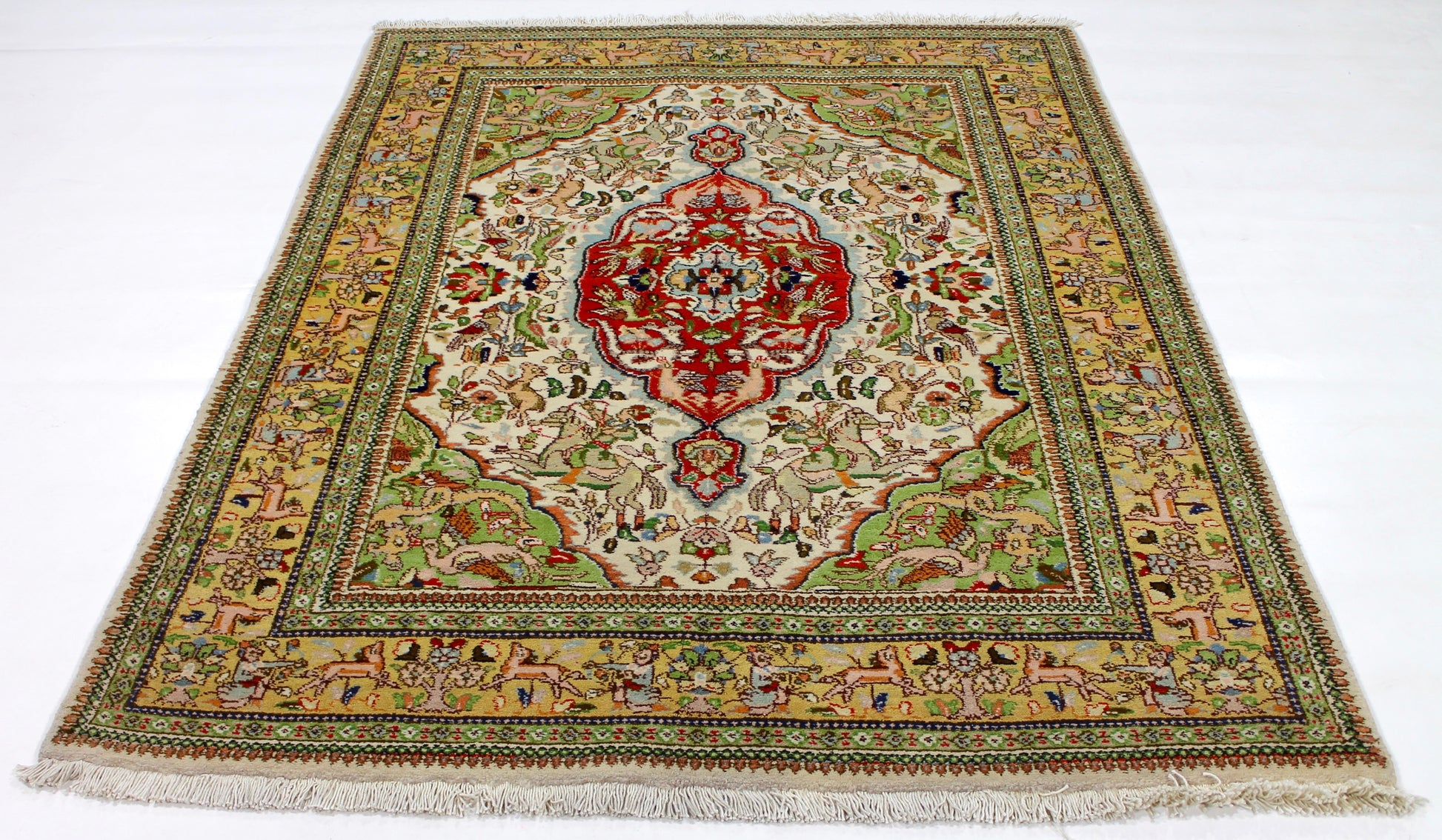 Dieser aus der Region Täbriz stammende Perserteppich wurde aus hochwertiger Schafwolle von Hand geknüpft. Sie ist das am häufigsten verwendete Material in der Teppichknüpfkunst und bringt eine Reihe beeindruckender Eigenschaften mit sich: